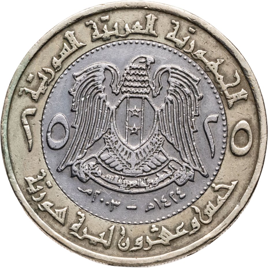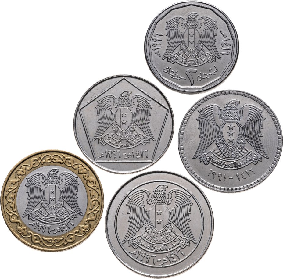 - К редким коллекционеры относят 5 фунтов 1996 года. На аверсе в пятиугольнике герб государства, на реверсе – цитадель Алеппо и номинал (также в обрамлении пятиугольника). 10-фунтовая монета, имеющая аналогичную дату выпуска, содержит герб на аверсе и развалины трехпролетной арки в Пальмире. Коллекционный интерес представляют 25 фунтов 1995 г. – биметаллическая монета, аверс которой украшен гербом, годом выпуска по двум календарям, номиналом. На реверсе изображен бюст президента Хафеза Асада. Еще одна интересная монета из биметалла – 25 лир 2003 года. Её дизайн напоминает предыдущую, но на реверсе изображен Центральный банк страны.