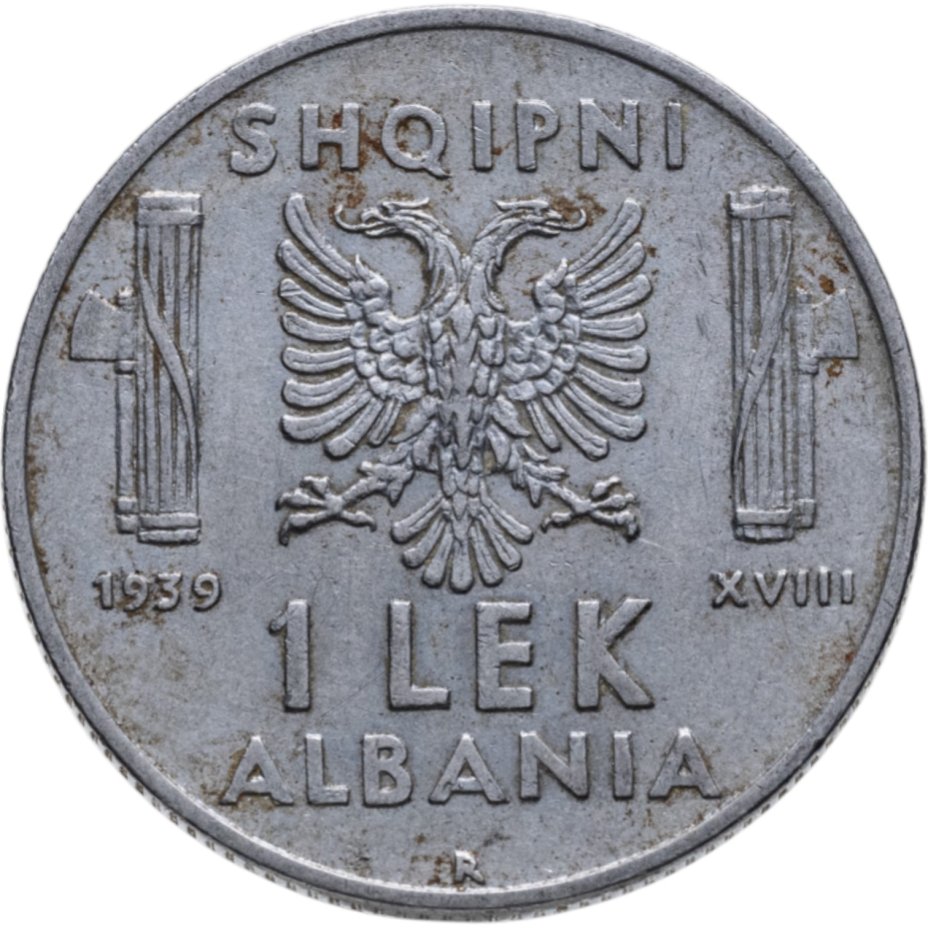 Герб Албании между двумя фасциями. Надписи: SHQIPNI / 1939 XVI / 1 LEK / ALBANIA / R.