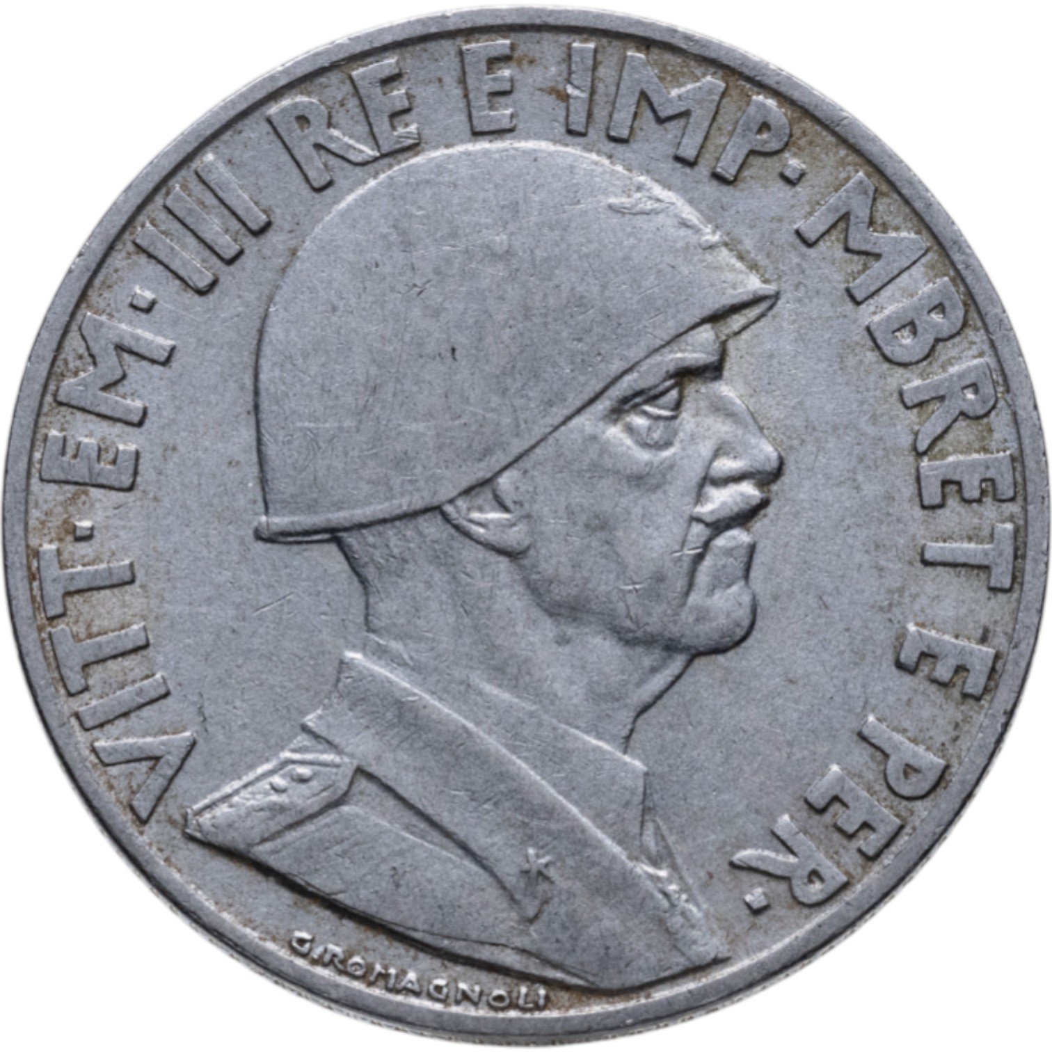 Бюст вправо короля Виктор Эммануил III в каске. Надписи: VITT·EM·III RE E IMP·MBRET E PER· / G.ROMAGNOLI.