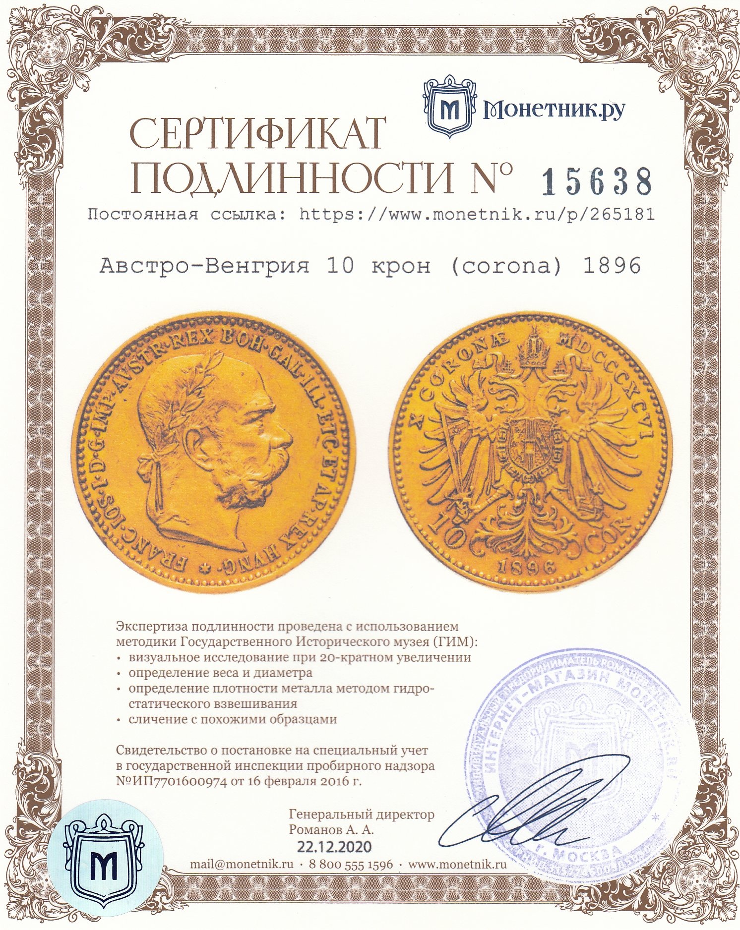 • Сертификат подлинности: № 15638