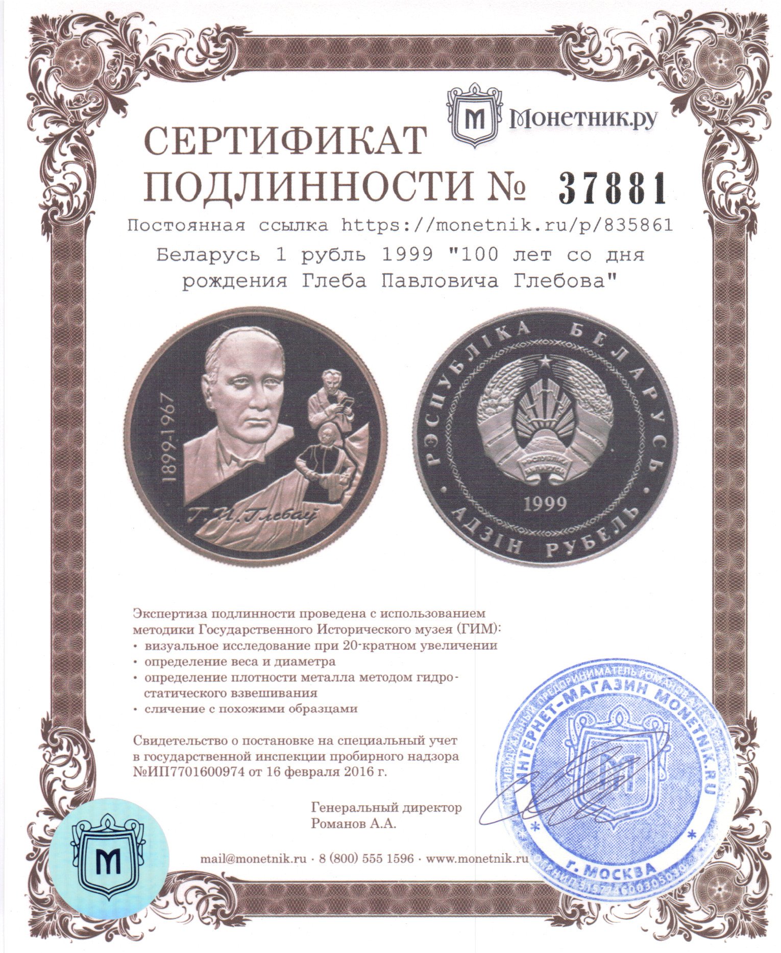 • Сертификат подлинности: № 37881