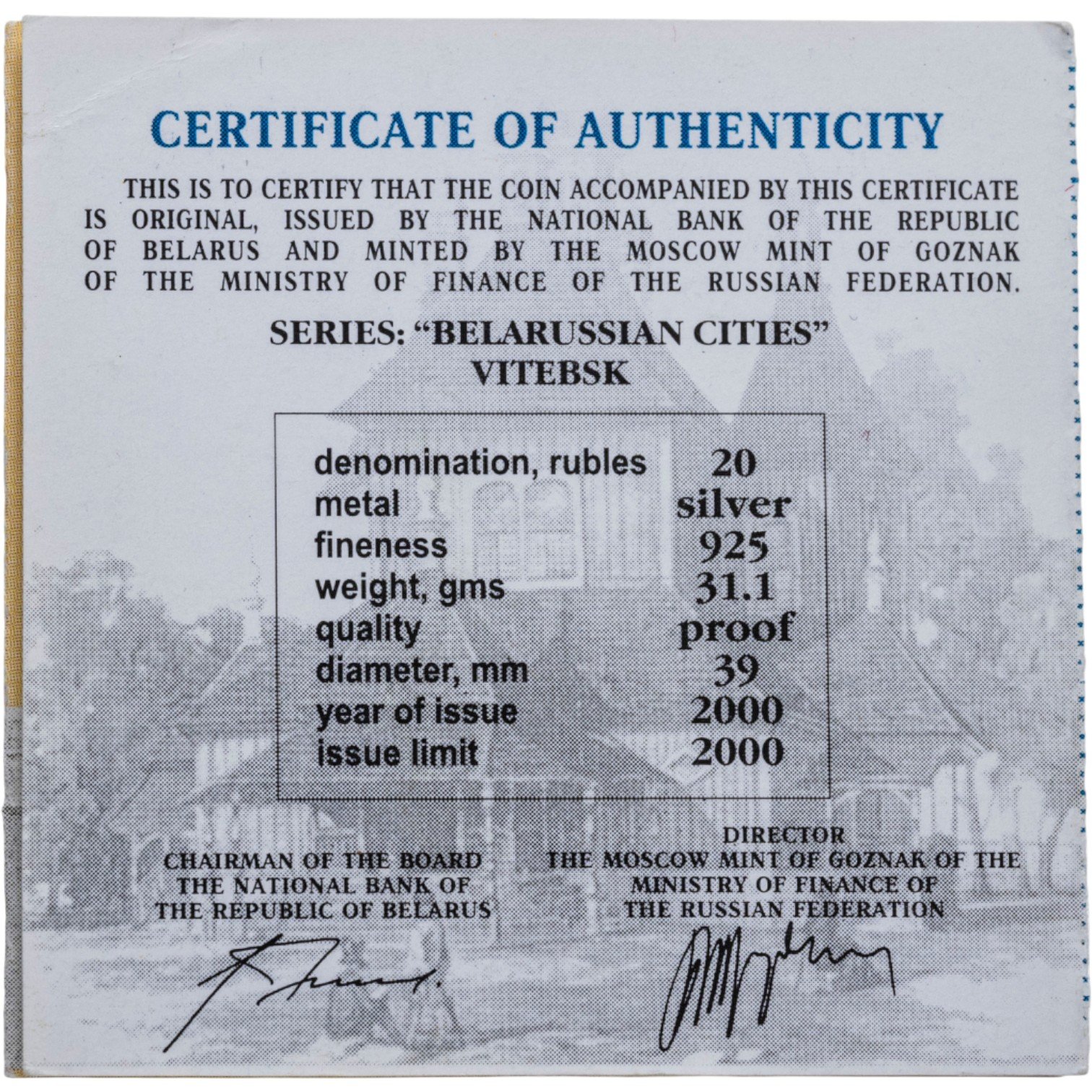 Беларусь 20 рублей 2000 "Города Беларуси: Витебск" с сертификатом