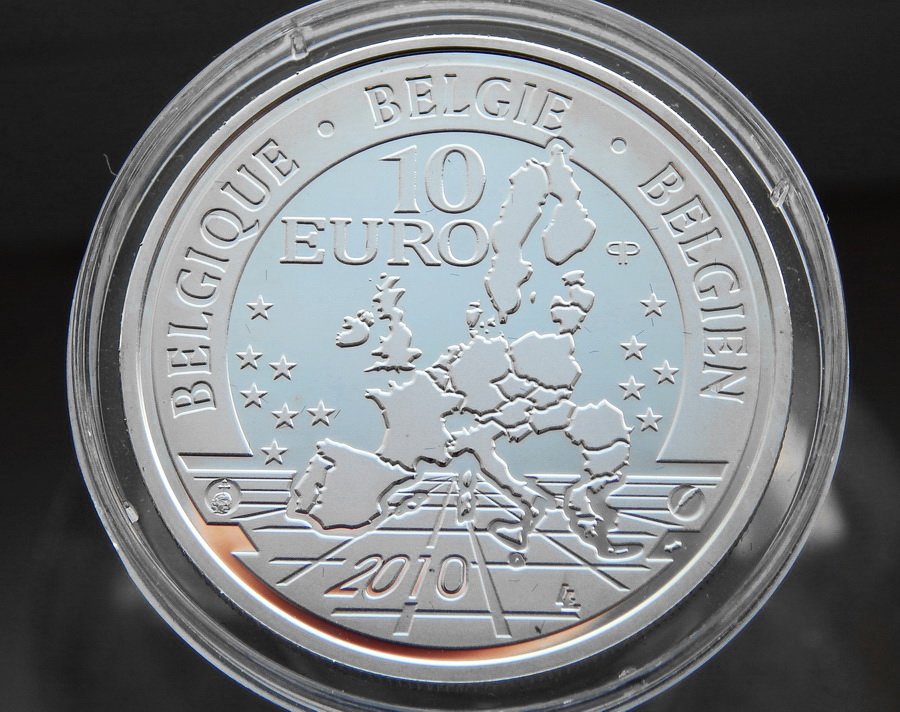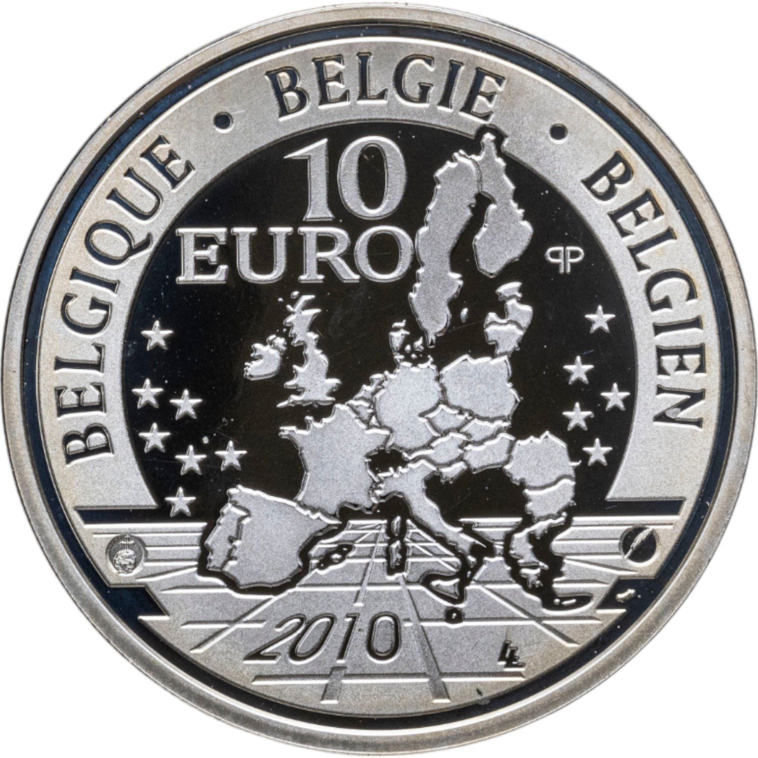 Описание аверса: в центральной части — стилизованная карта Европы на фоне 12 пятиконечных звёзд, символизирующих 12 стран-членов Европейкого Союза. Над ней текст на английском в две строки: «10 EURO» — 10 евро, под ней — год чекана: 2009 и литера Брюссельского монетного двора — голова Архангела Михаила. Слева, сверху и справа вдоль канта название страны на французском, нидерландском и немецком языках: «BELGIQUE — BELGIE — BELGIEN» — Бельгия
