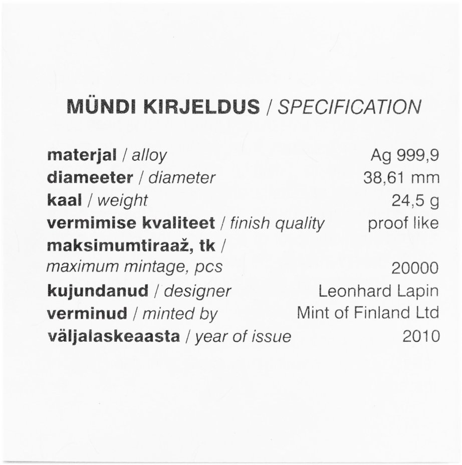 - Тираж: Монетный двор: Хельсинки-Вантаа, Финляндия; Proof=15000 шт.