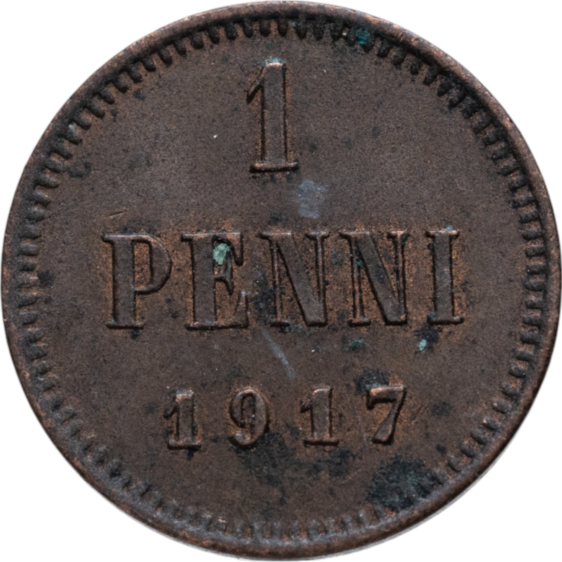 В центре - надпись в три строки: «1»│«PENNI»│«1917». По окружности канта имеются рельефные элементы, выполненные в виде зубцов.