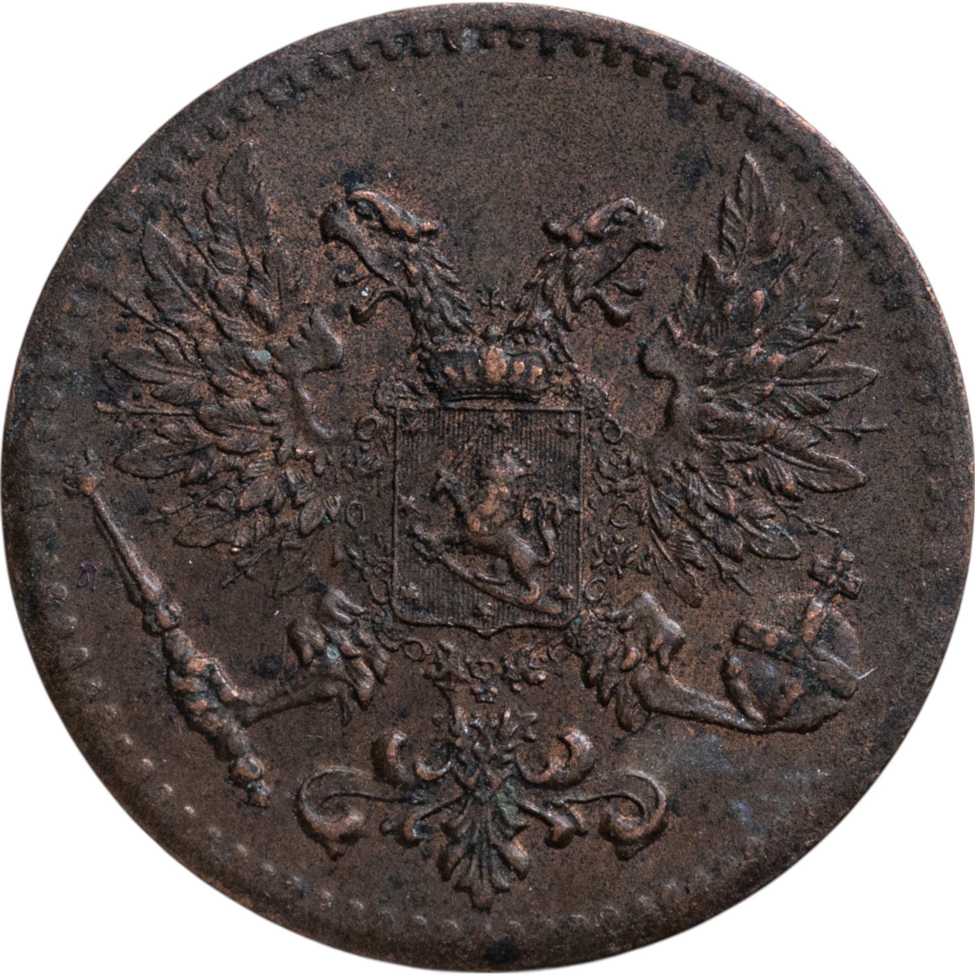 В центре изображён полный Герб Великого княжества Финляндского образца 1917 года - двуглавый орёл без корон, на груди которого расположен щит с титульным гербом Великого князя Финляндского, увенчанный княжеской короной. Вокруг щита орденская цепь с орденом Св. апостола Андрея Первозванного. В правой лапе орла – скипетр, в левой – держава. По окружности канта имеются рельефные элементы, выполненные в виде зубцов.