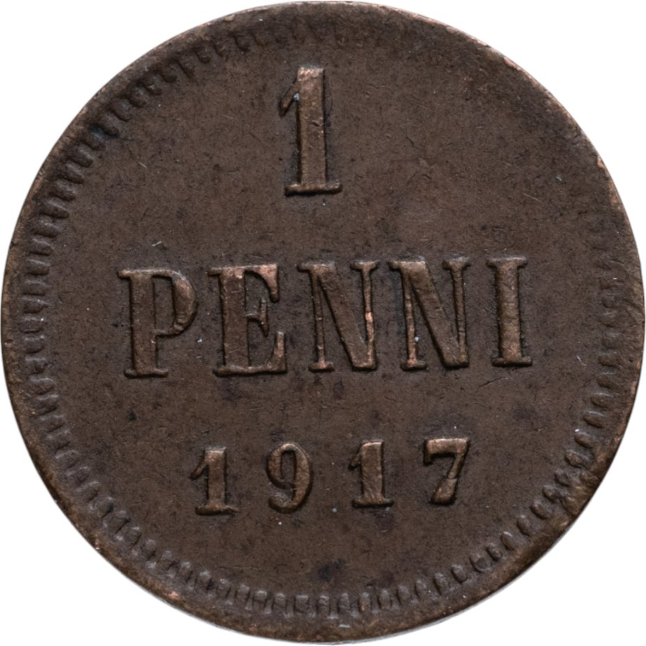 В центре - надпись в три строки: «1»│«PENNI»│«1917». По окружности канта имеются рельефные элементы, выполненные в виде зубцов.