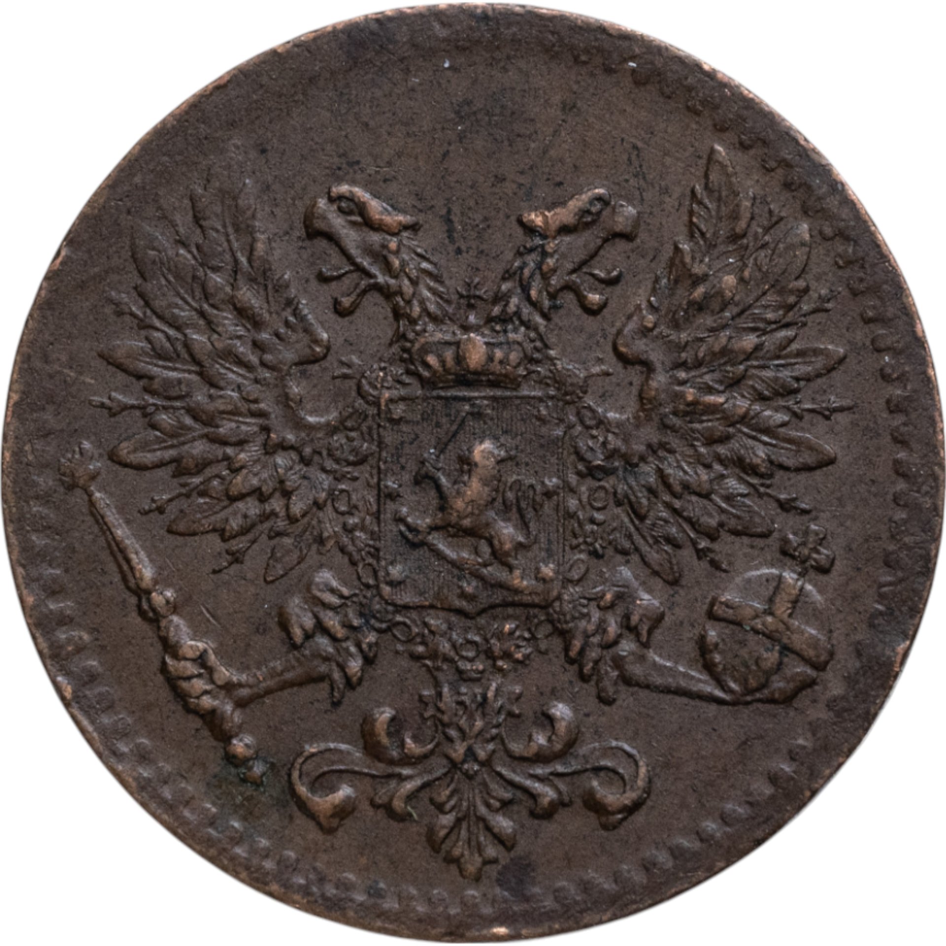 В центре изображён полный Герб Великого княжества Финляндского образца 1917 года - двуглавый орёл без корон, на груди которого расположен щит с титульным гербом Великого князя Финляндского, увенчанный княжеской короной. Вокруг щита орденская цепь с орденом Св. апостола Андрея Первозванного. В правой лапе орла – скипетр, в левой – держава. По окружности канта имеются рельефные элементы, выполненные в виде зубцов.