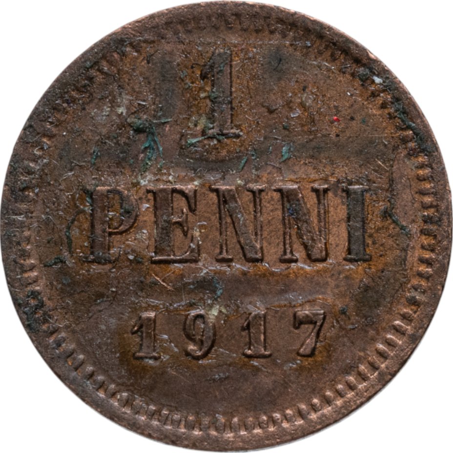 В центре - надпись в три строки: «1»│«PENNI»│«1917». По окружности канта имеются рельефные элементы, выполненные в виде зубцов.