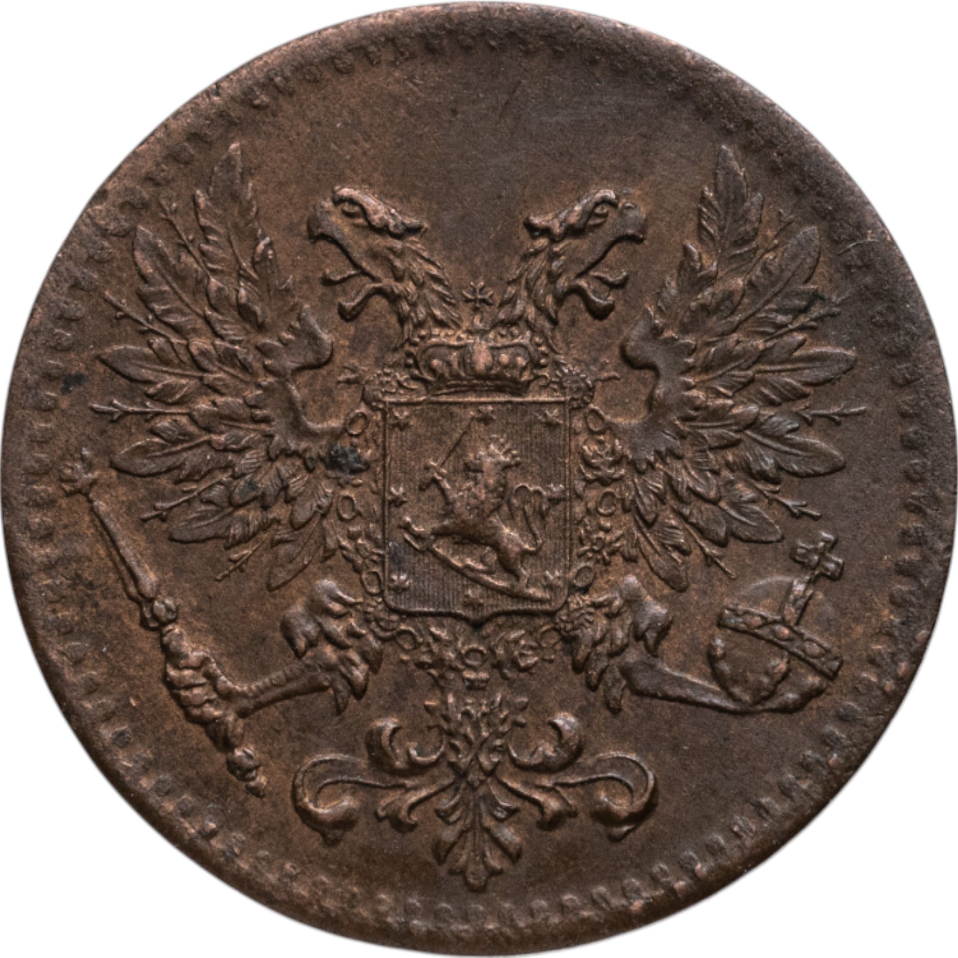 В центре изображён полный Герб Великого княжества Финляндского образца 1917 года - двуглавый орёл без корон, на груди которого расположен щит с титульным гербом Великого князя Финляндского, увенчанный княжеской короной. Вокруг щита орденская цепь с орденом Св. апостола Андрея Первозванного. В правой лапе орла – скипетр, в левой – держава. По окружности канта имеются рельефные элементы, выполненные в виде зубцов.