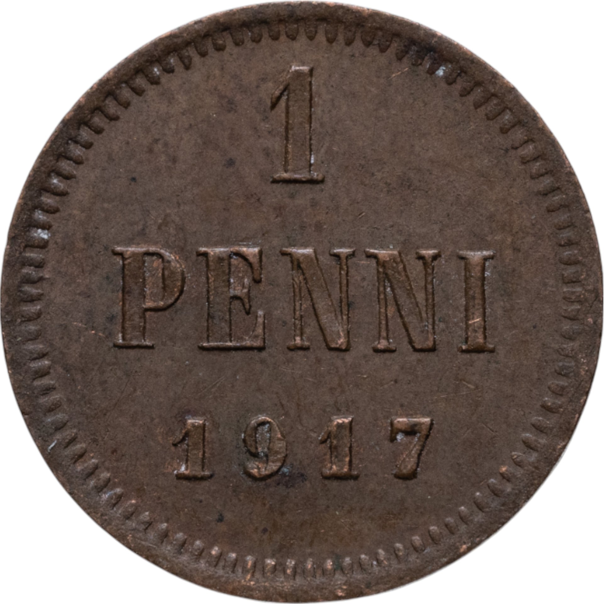 В центре - надпись в три строки: «1»│«PENNI»│«1917». По окружности канта имеются рельефные элементы, выполненные в виде зубцов.