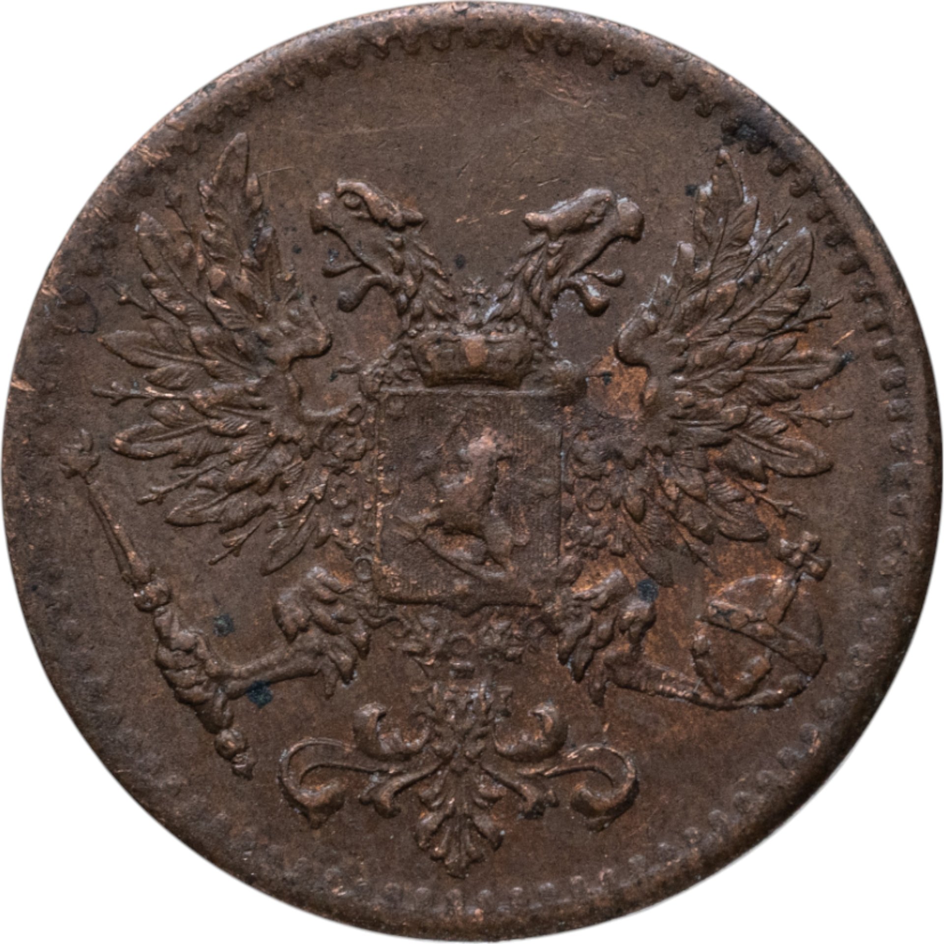 В центре изображён полный Герб Великого княжества Финляндского образца 1917 года - двуглавый орёл без корон, на груди которого расположен щит с титульным гербом Великого князя Финляндского, увенчанный княжеской короной. Вокруг щита орденская цепь с орденом Св. апостола Андрея Первозванного. В правой лапе орла – скипетр, в левой – держава. По окружности канта имеются рельефные элементы, выполненные в виде зубцов.