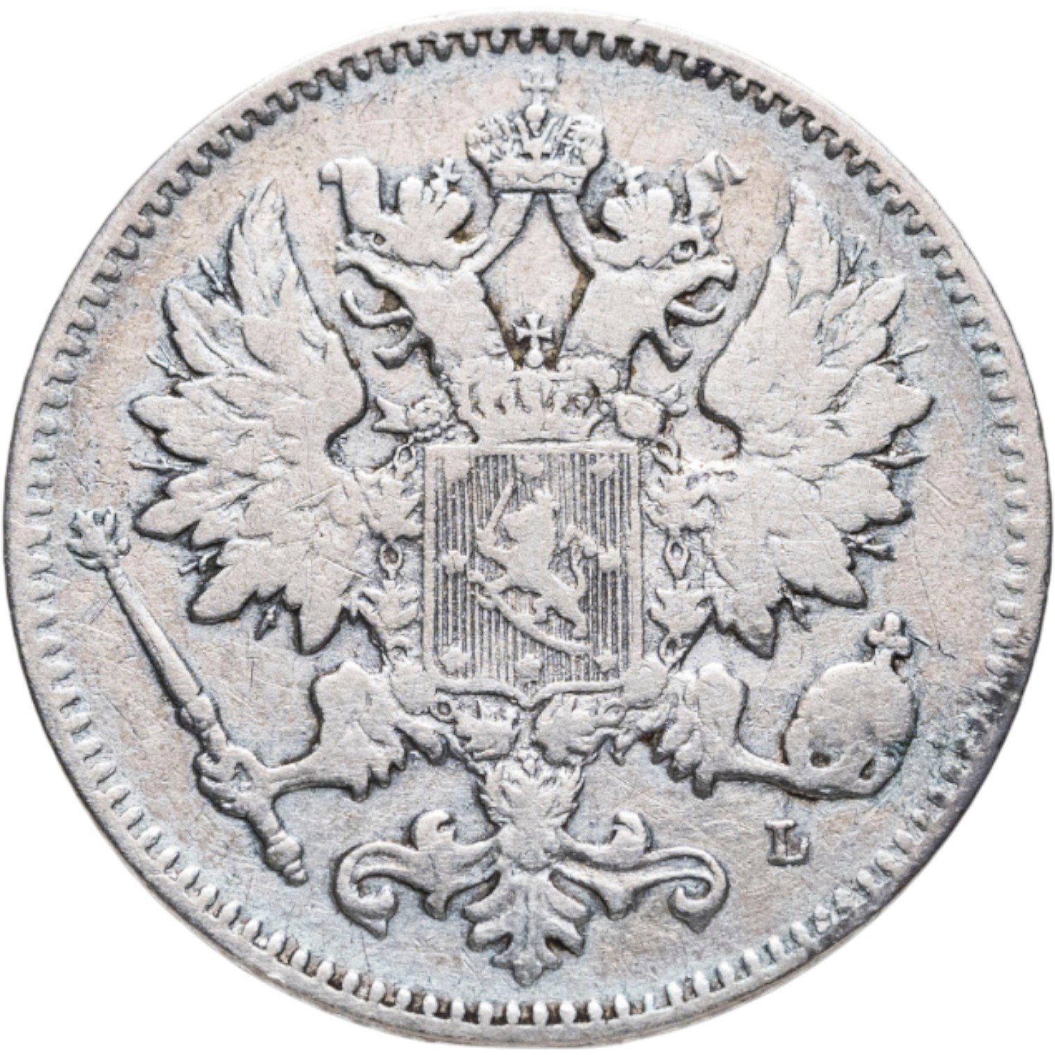 В центре изображён полный Герб Великого княжества Финляндского - двуглавый орёл, головы которого увенчаны двумя коронами, третья, большая корона над ними. Все они соединены орденской лентой ордена Св. Апостола Андрея Первозванного. На груди орла расположен щит с титульным гербом Великого князя Финляндского, увенчанный княжеской короной. Вокруг щита орденская цепь с орденом Св. Апостола Андрея Первозванного. В правой лапе орла – скипетр, в левой – держава. Под левой лапой знак директора Гельсингфосского монетного двора - литера «L», Johan Conrad Lihr (Йохан Конрад Лир). По окружности канта имеются рельефные элементы, выполненные в виде зубцов.