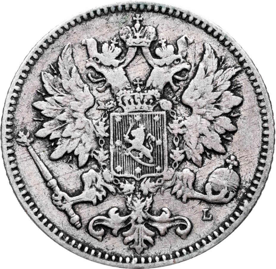 В центре изображён полный Герб Великого княжества Финляндского - двуглавый орёл, головы которого увенчаны двумя коронами, третья, большая корона над ними. Все они соединены орденской лентой ордена Св. Апостола Андрея Первозванного. На груди орла расположен щит с титульным гербом Великого князя Финляндского, увенчанный княжеской короной. Вокруг щита орденская цепь с орденом Св. Апостола Андрея Первозванного. В правой лапе орла – скипетр, в левой – держава. Под левой лапой знак директора Гельсингфосского монетного двора - литера «L», Johan Conrad Lihr (Йохан Конрад Лир). По окружности канта имеются рельефные элементы, выполненные в виде зубцов.