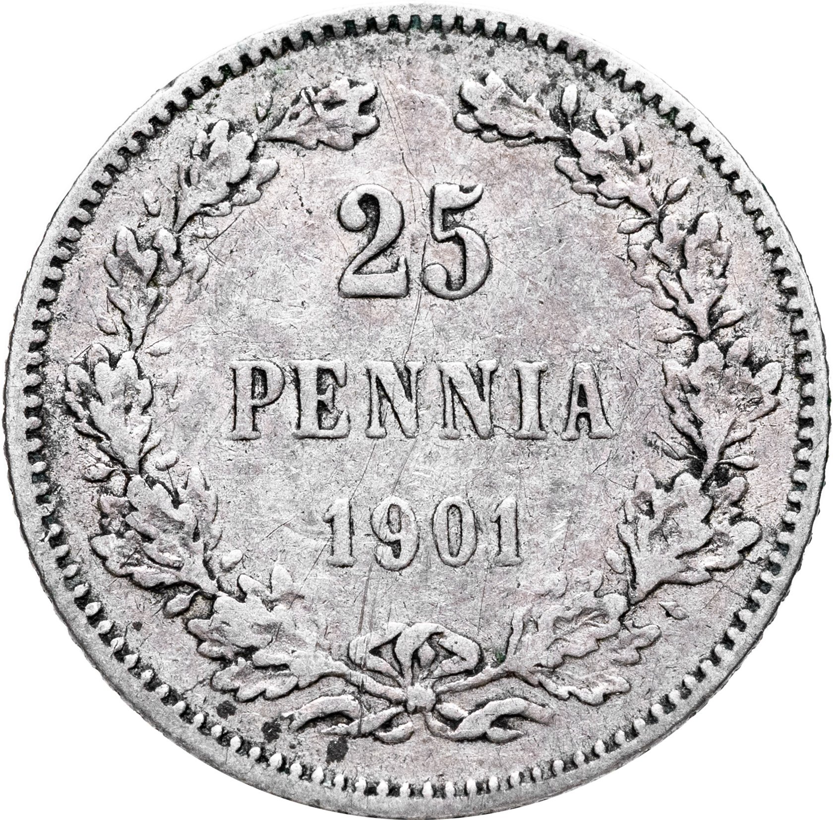 В центре - надпись в три строки: «25»│«PENNIÄ»│«1901». Вдоль канта изображён не замкнутый венок из двух дубовых ветвей, которые, в нижней части, перевязаны лентой на узел двойным бантом. По окружности канта имеются рельефные элементы, выполненные в виде зубцов.