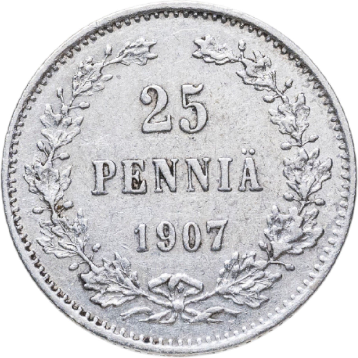 В центре - надпись в три строки: «25»│«PENNIÄ»│«1907». Вдоль канта изображён не замкнутый венок из двух дубовых ветвей, которые, в нижней части, перевязаны лентой на узел двойным бантом. По окружности канта имеются рельефные элементы, выполненные в виде зубцов.