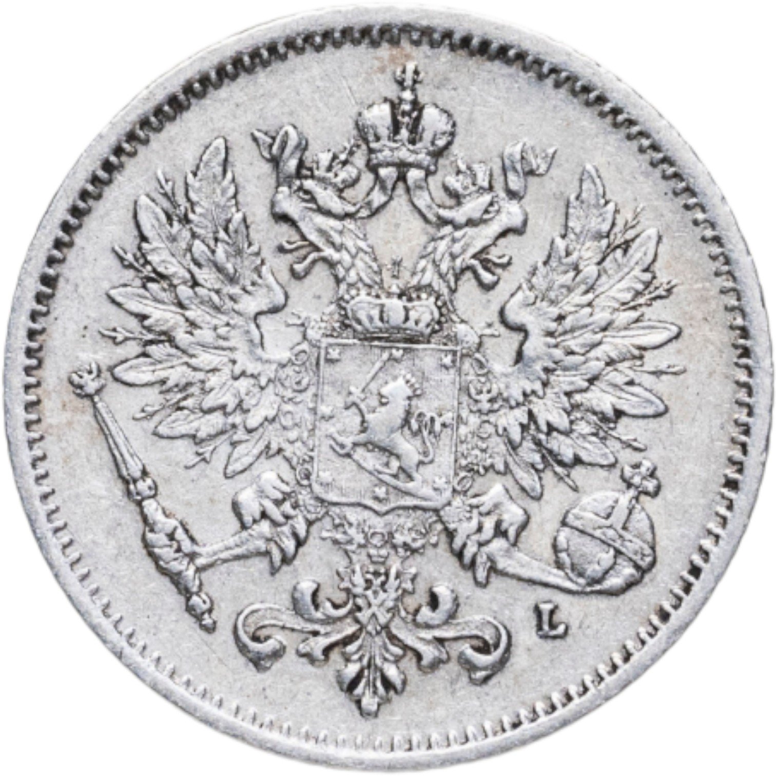 В центре изображён полный Герб Великого княжества Финляндского - двуглавый орёл, головы которого увенчаны двумя коронами, третья, большая корона над ними. Все они соединены орденской лентой ордена Св. Апостола Андрея Первозванного. На груди орла расположен щит с титульным гербом Великого князя Финляндского, увенчанный княжеской короной. Вокруг щита орденская цепь с орденом Св. Апостола Андрея Первозванного. В правой лапе орла – скипетр, в левой – держава. Под левой лапой знак директора Гельсингфосского монетного двора - литера «L», Johan Conrad Lihr (Йохан Конрад Лир). По окружности канта имеются рельефные элементы, выполненные в виде зубцов.