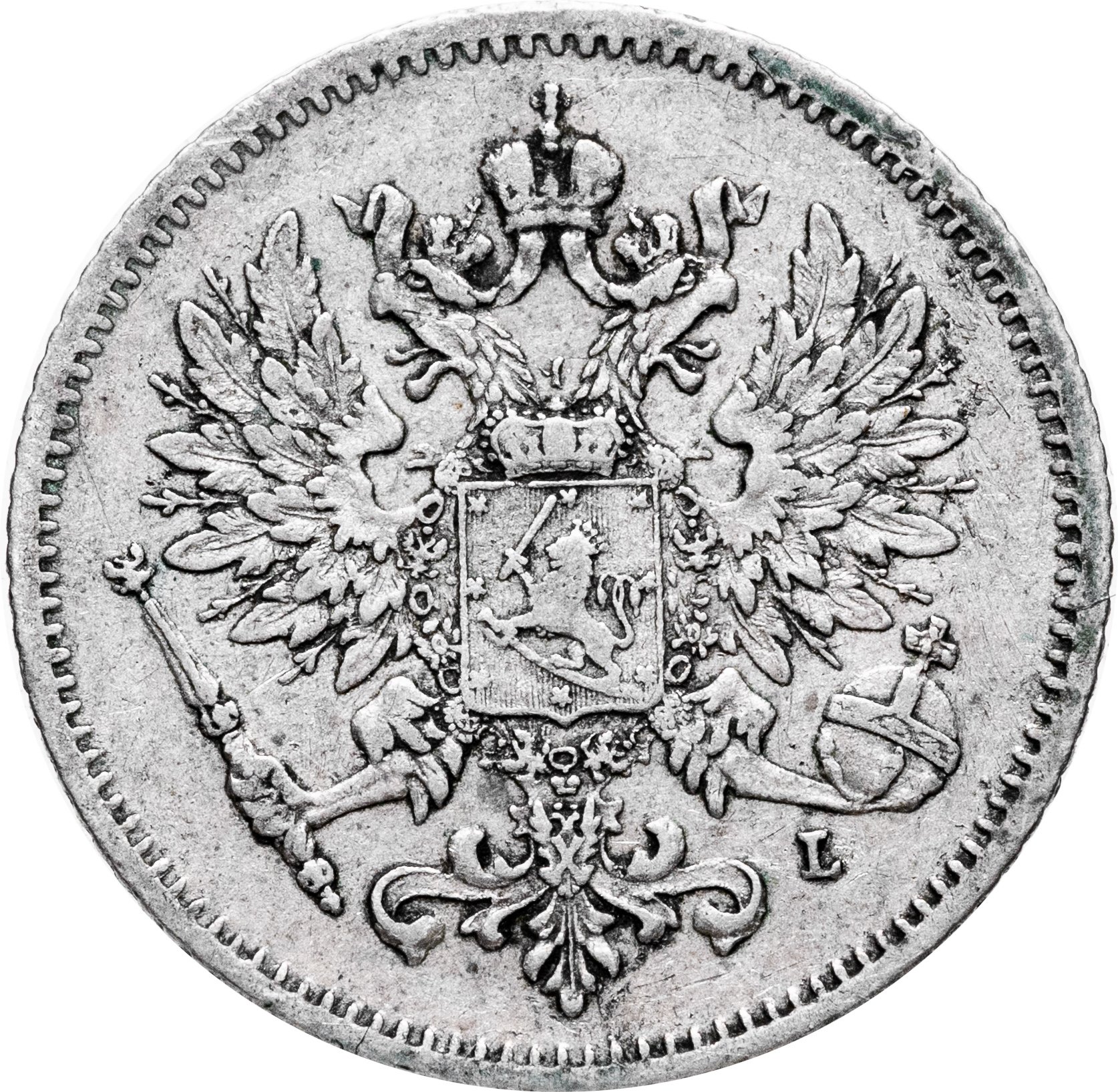 В центре изображён полный Герб Великого княжества Финляндского - двуглавый орёл, головы которого увенчаны двумя коронами, третья, большая корона над ними. Все они соединены орденской лентой ордена Св. Апостола Андрея Первозванного. На груди орла расположен щит с титульным гербом Великого князя Финляндского, увенчанный княжеской короной. Вокруг щита орденская цепь с орденом Св. Апостола Андрея Первозванного. В правой лапе орла – скипетр, в левой – держава. Под левой лапой знак директора Гельсингфосского монетного двора - литера «L», Johan Conrad Lihr (Йохан Конрад Лир). По окружности канта имеются рельефные элементы, выполненные в виде зубцов.
