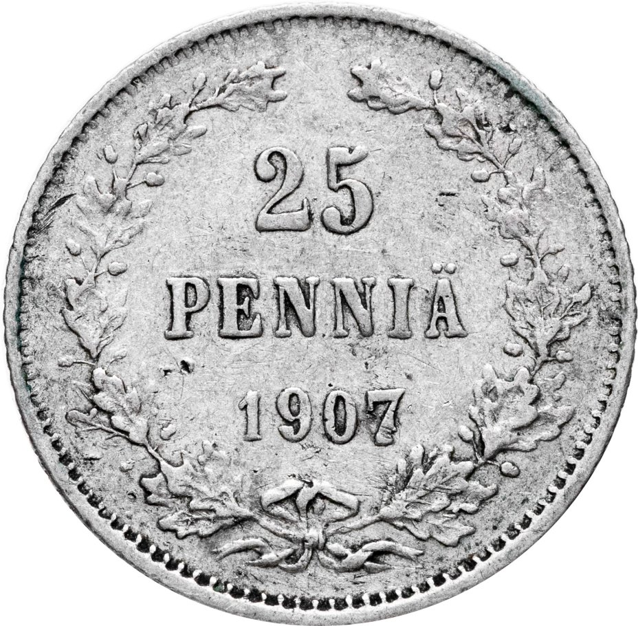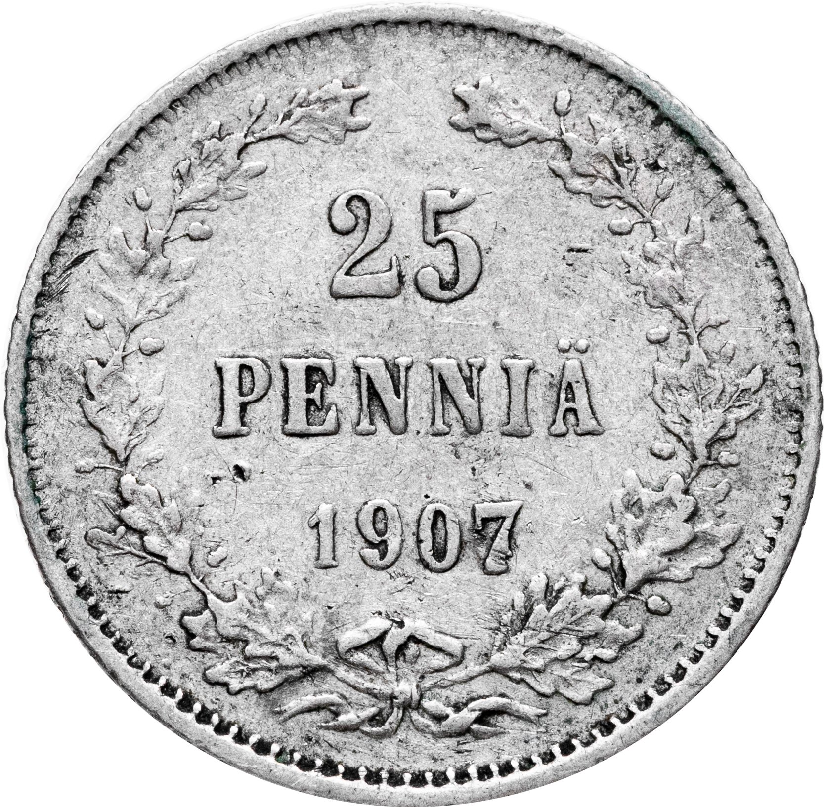 В центре - надпись в три строки: «25»│«PENNIÄ»│«1907». Вдоль канта изображён не замкнутый венок из двух дубовых ветвей, которые, в нижней части, перевязаны лентой на узел двойным бантом. По окружности канта имеются рельефные элементы, выполненные в виде зубцов.