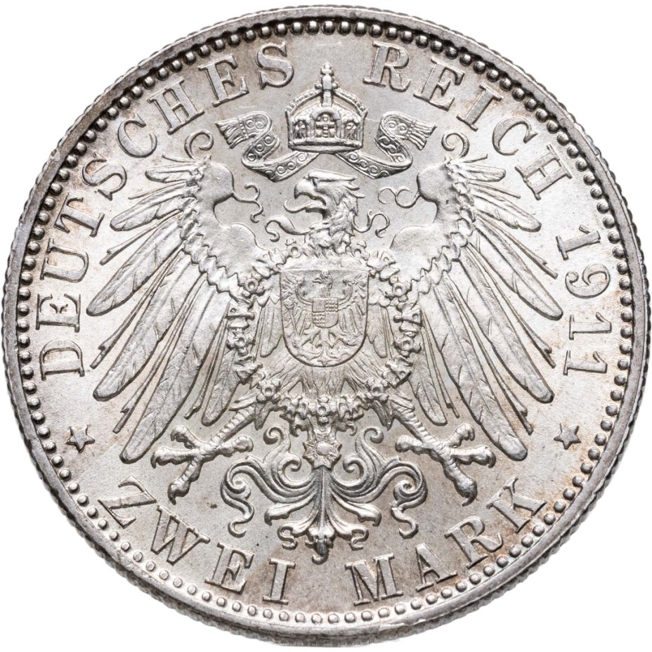 Германская Империя, Бавария 2 марки (mark) 1914 Знак монетного двора "D" - Мюнхен, Германия