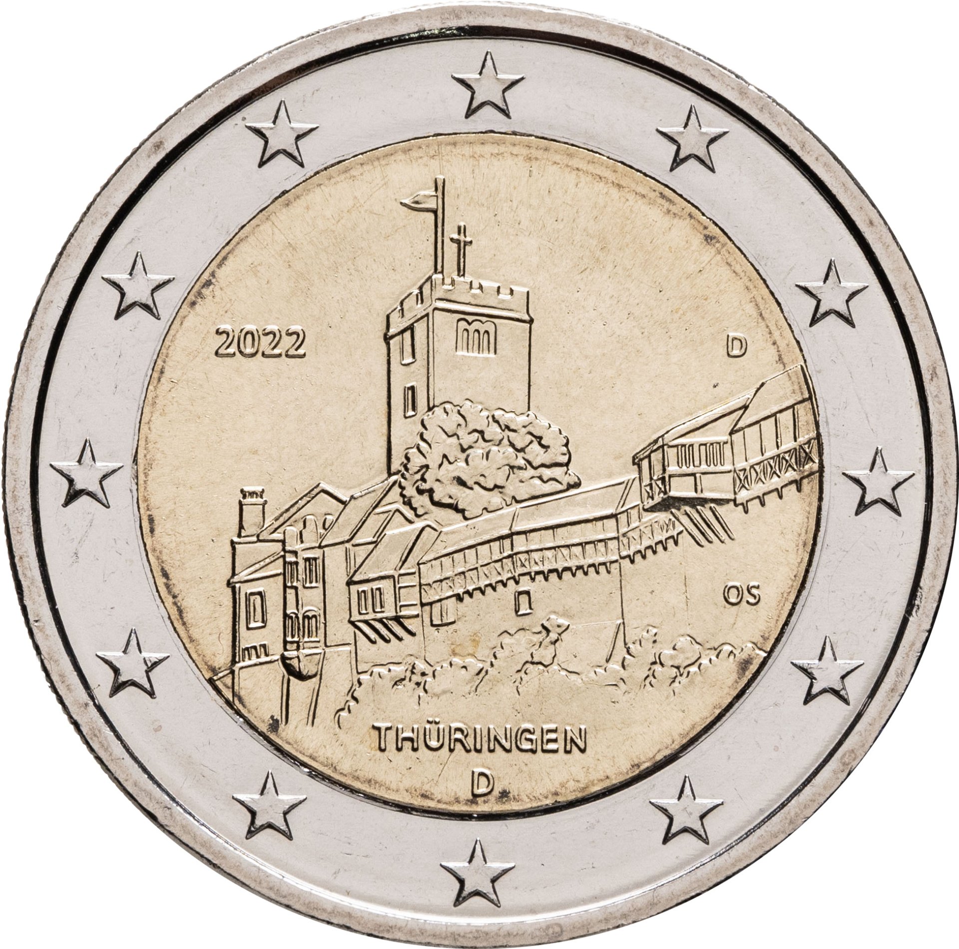 Германия 2 евро (euro) 2022 Федеральная земля Тюрингия - замок Вартбург, знак монетного двора "D" - Мюнхен