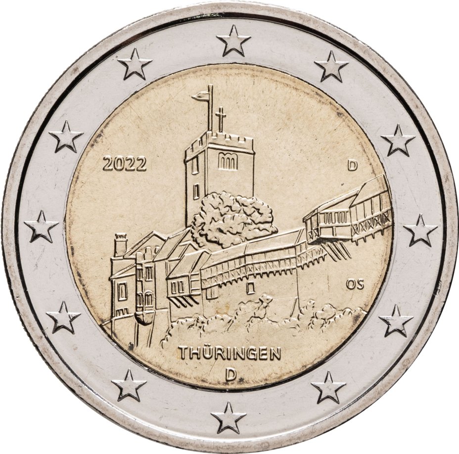 Купить Германия 2 евро (euro) 2022 Федеральная земля Тюрингия - замок Вартбург, знак монетного двора "D" - Мюнхен