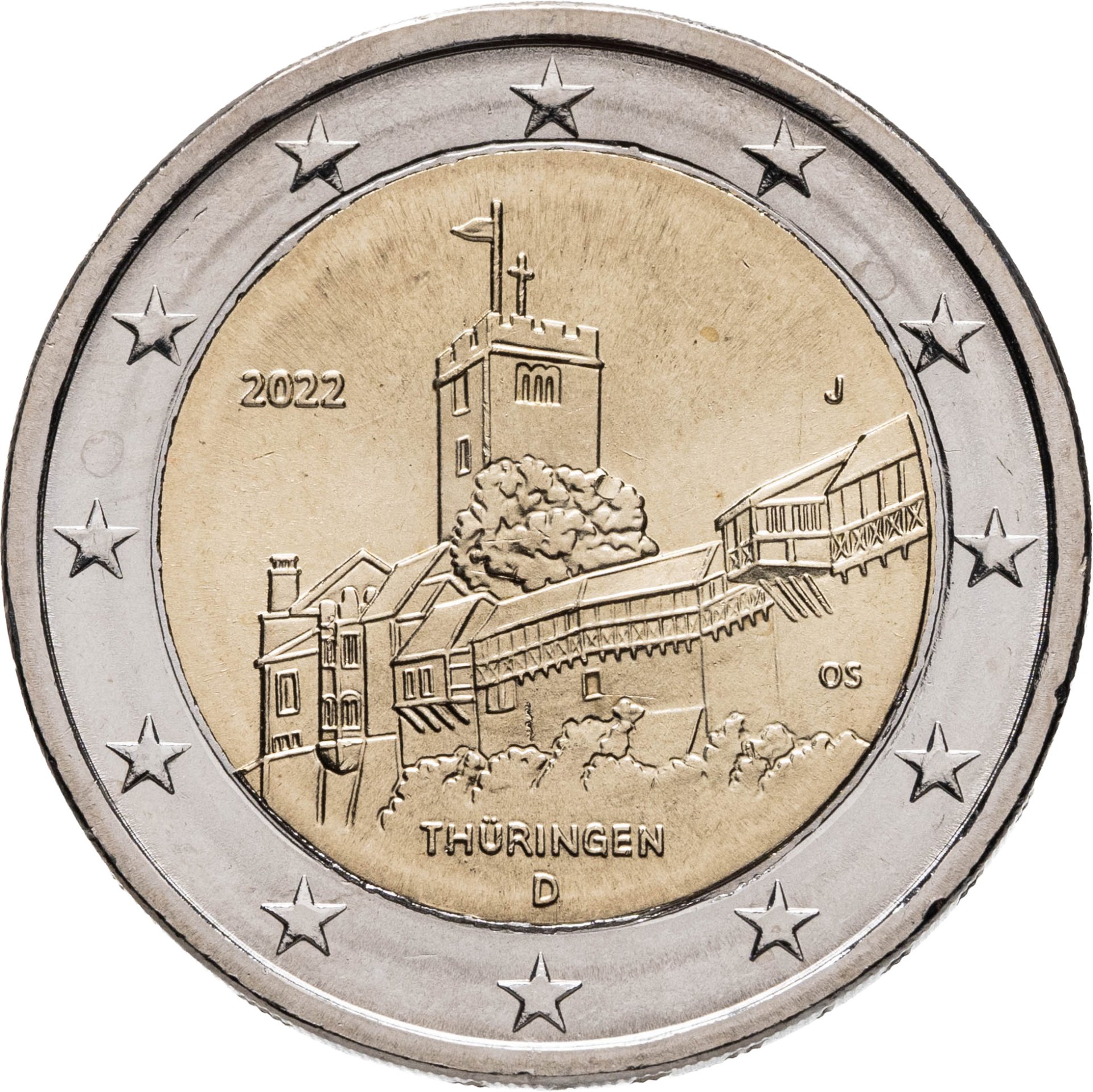 Германия 2 евро (euro) 2022 Федеральная земля Тюрингия - замок Вартбург, знак монетного двора "J"