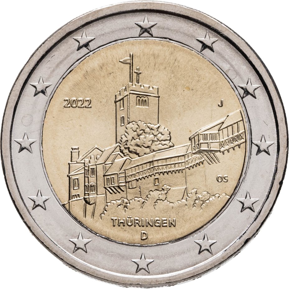 Купить Германия 2 евро (euro) 2022 Федеральная земля Тюрингия - замок Вартбург, знак монетного двора "J"