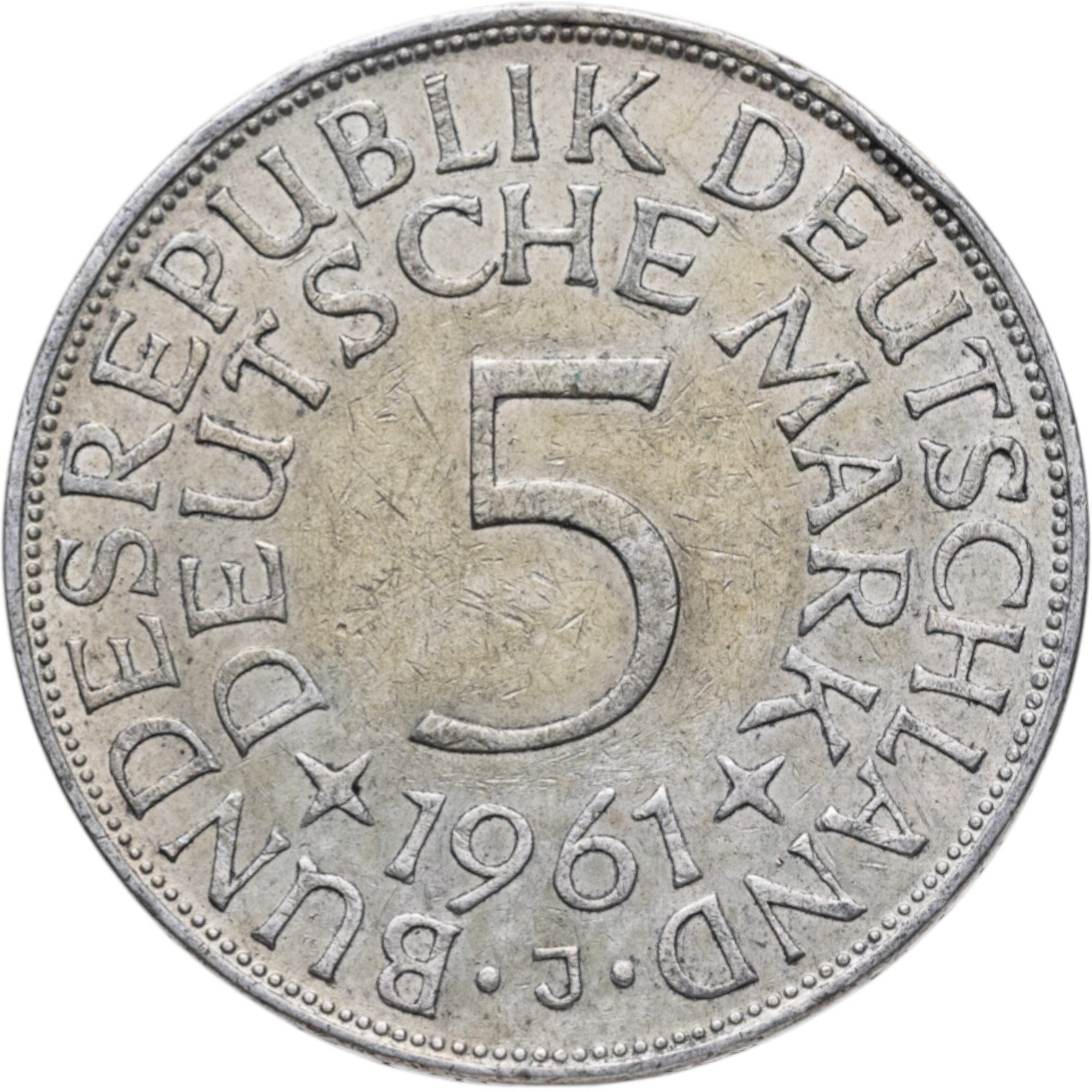 Германия 5 марок, 1961 Отметка монетного двора: "J" - Гамбург