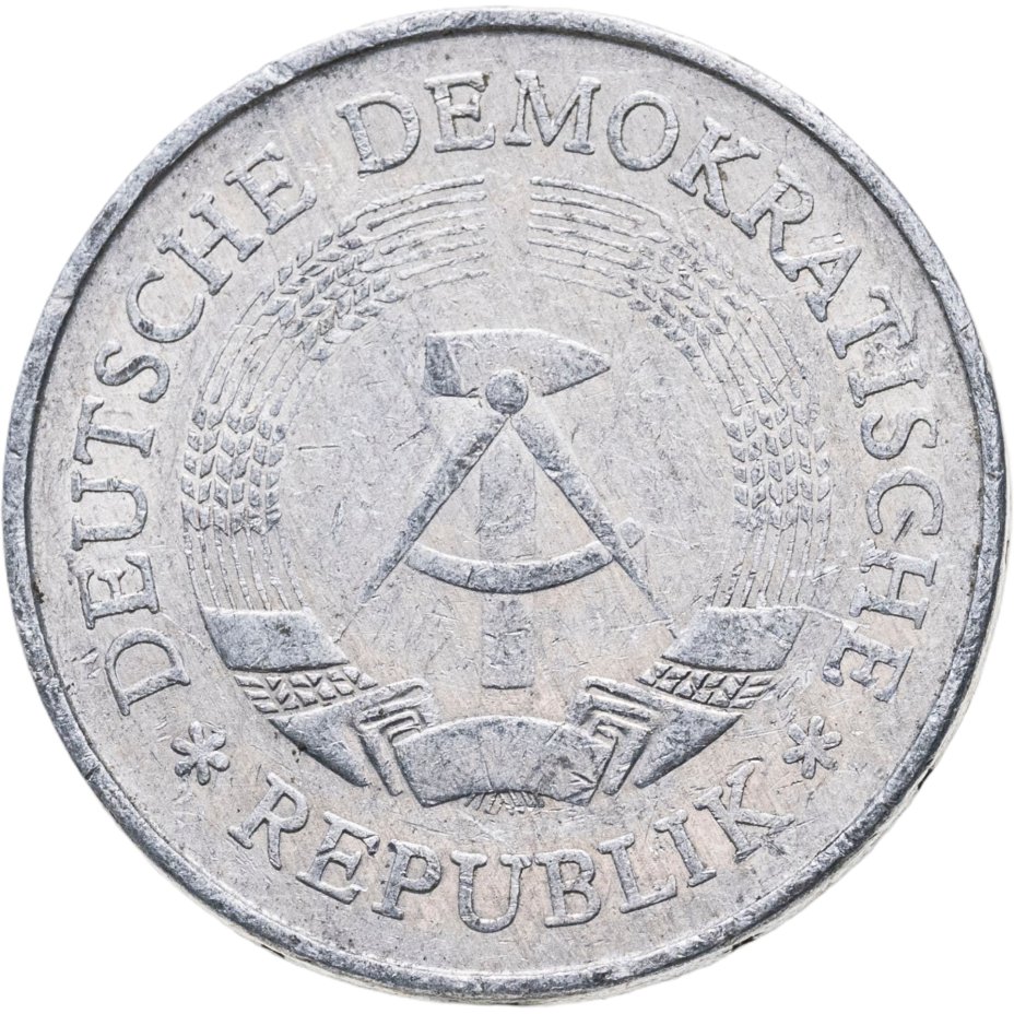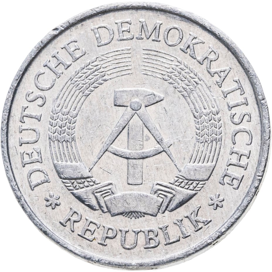 С 1949 года ГДР начинает чеканку собственных монет. Монеты номиналом 1, 5 и 10 пфеннигов чеканятся из алюминия и имеют практически идентичный дизайн: на аверсе монеты крупно изображен номинал и надпись PFENNIG, сверху - название страны DEUTSCHLAND, внизу - буквенное обозначение монетного двора. На реверсе помимо даты изготовления монеты изображены шестеренка и колос, символизирующие единство рабочих и крестьян. Выделяется из общего ряда монета номиналом 50 пфеннигов 1949-1950 годов. Она изготовлена из алюминиевой бронзы, что сказалось на её цвете. Изменен шрифт всех элементов аверса, а на реверсе изображен плуг на фоне завода.