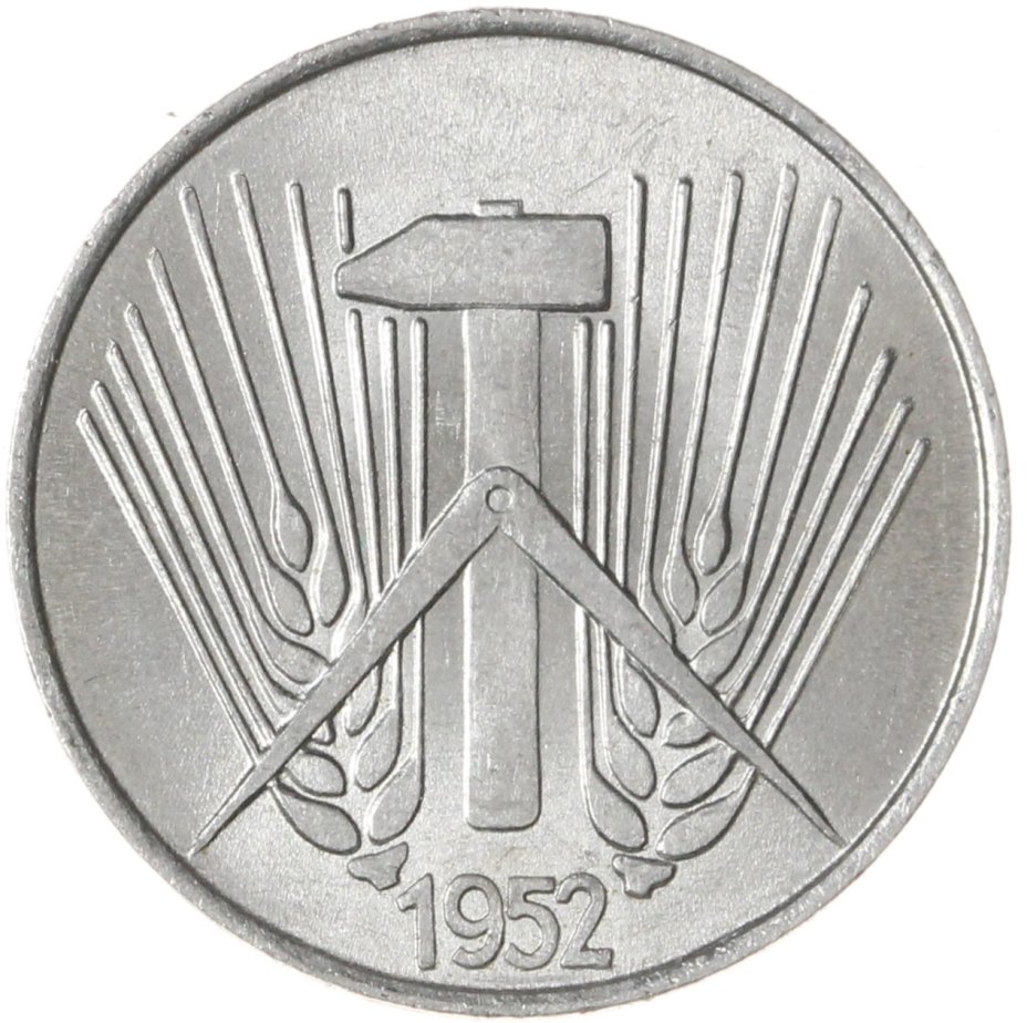 В 1952-1953 годах реверс монет 1, 5 и 10 пфеннигов претерпевает изменения: вместо шестеренки появляется молоток, пшеничный сноп раздваивается и размещается по обе части от молота, а также появляется изображение циркуля, символизирующего интеллигенцию. Аверс монет остается прежним.
