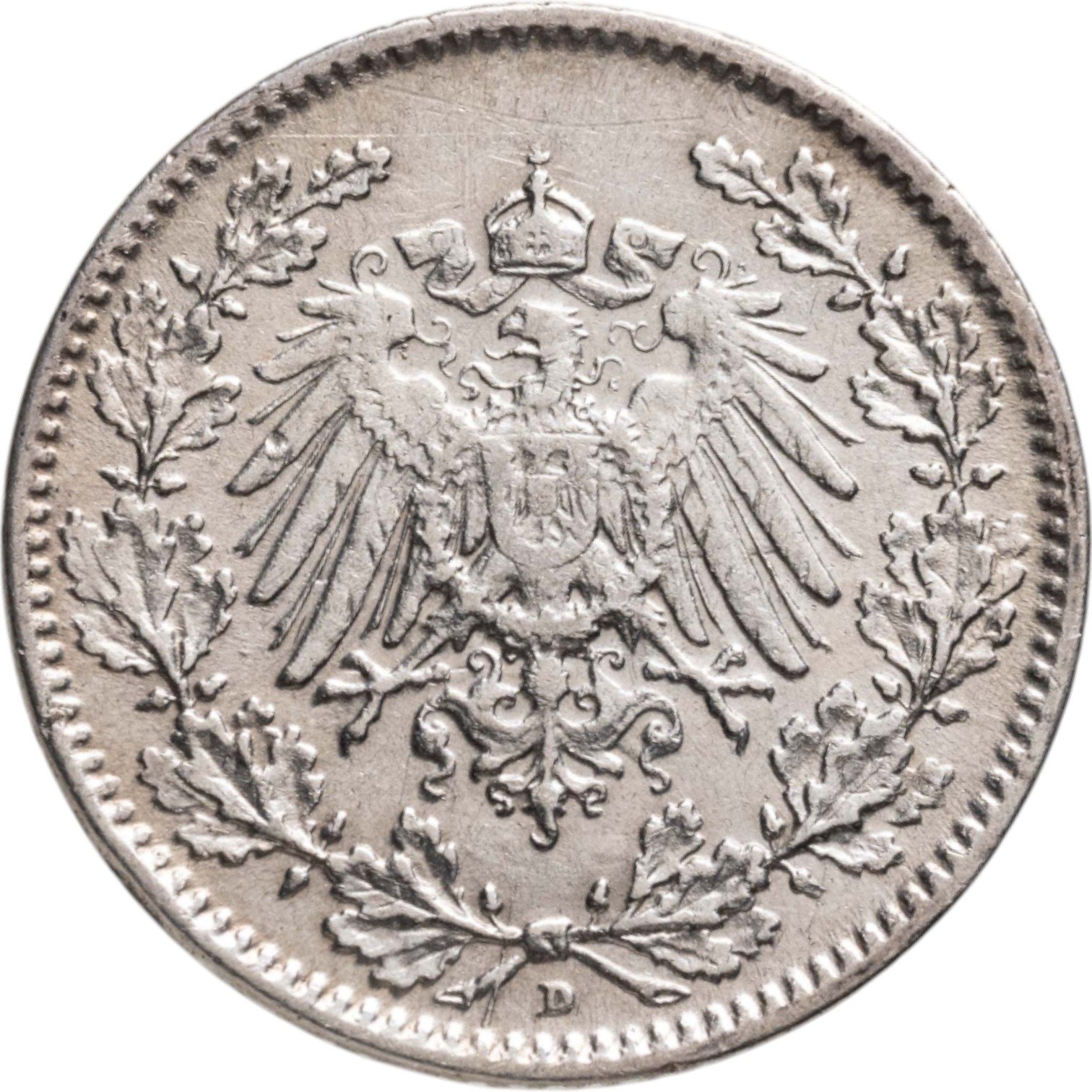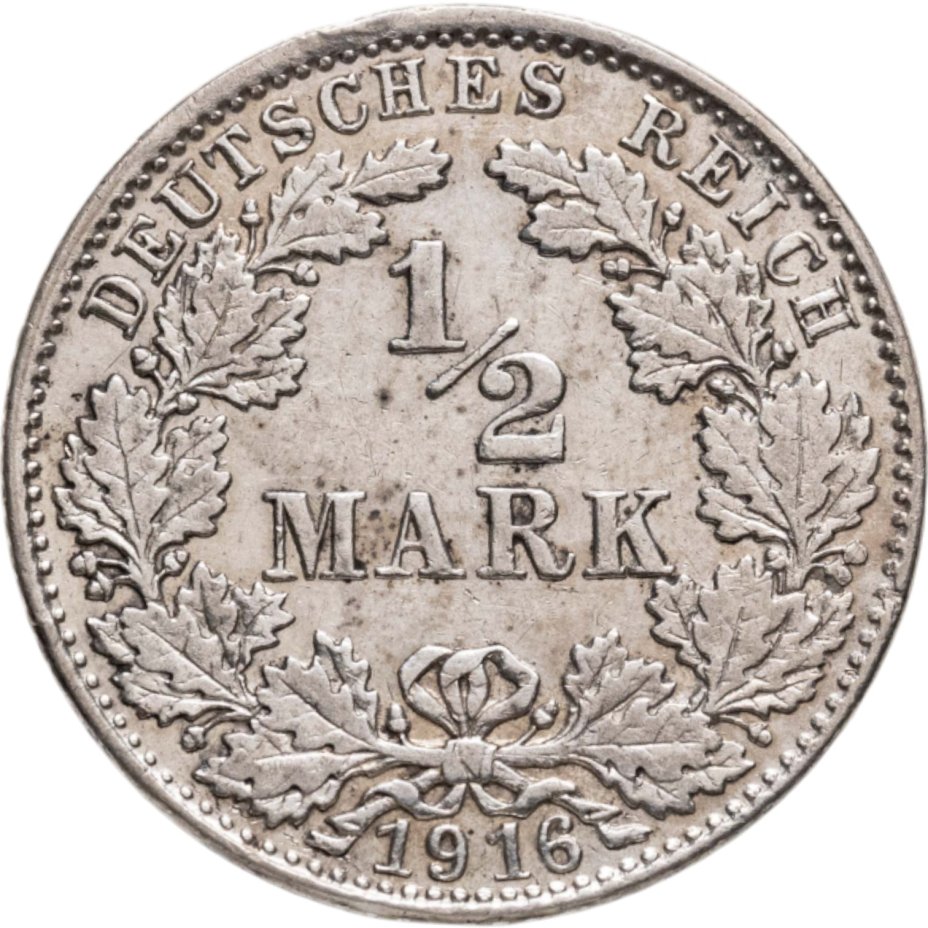 Германия 1/2 марки (mark) 1916 Знак монетного двора: "D" - Мюнхен