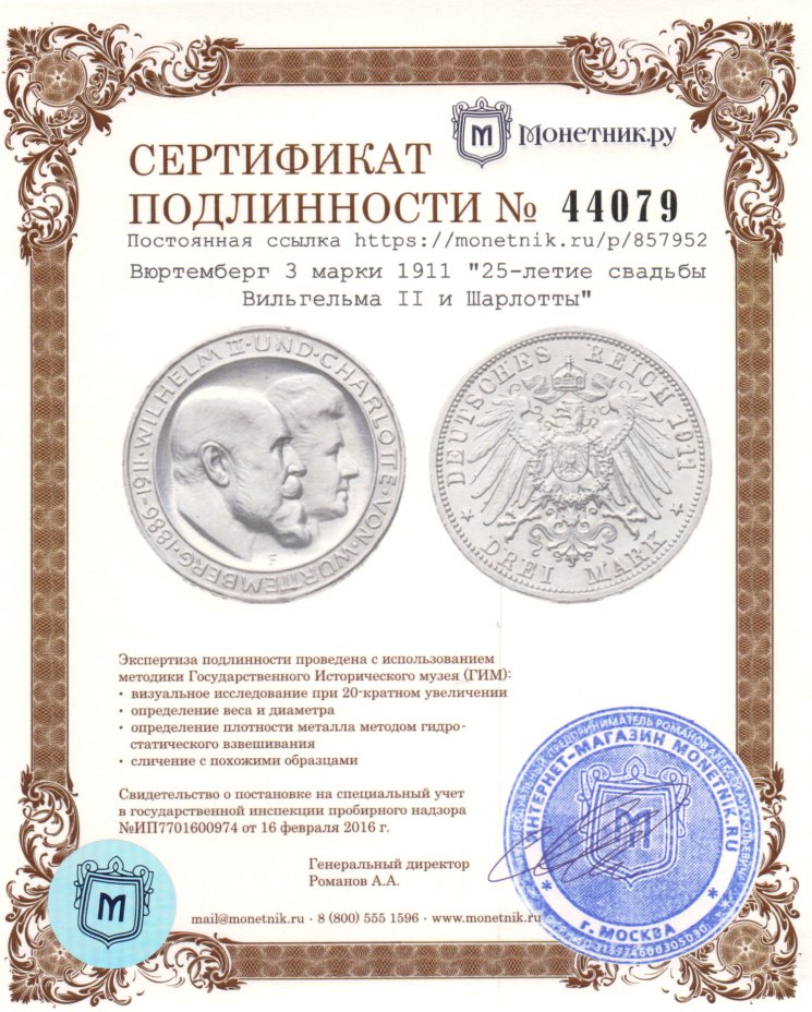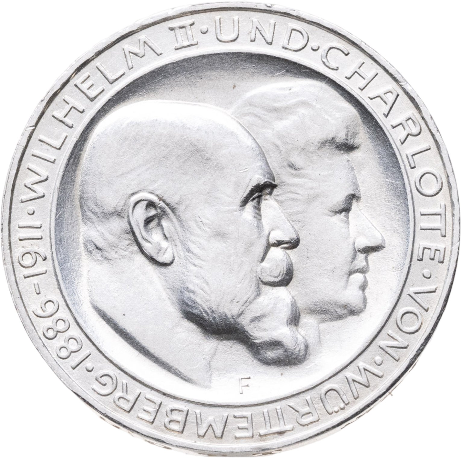 Вюртемберг 3 марки 1911 "25-летие свадьбы Вильгельма II и Шарлотты"