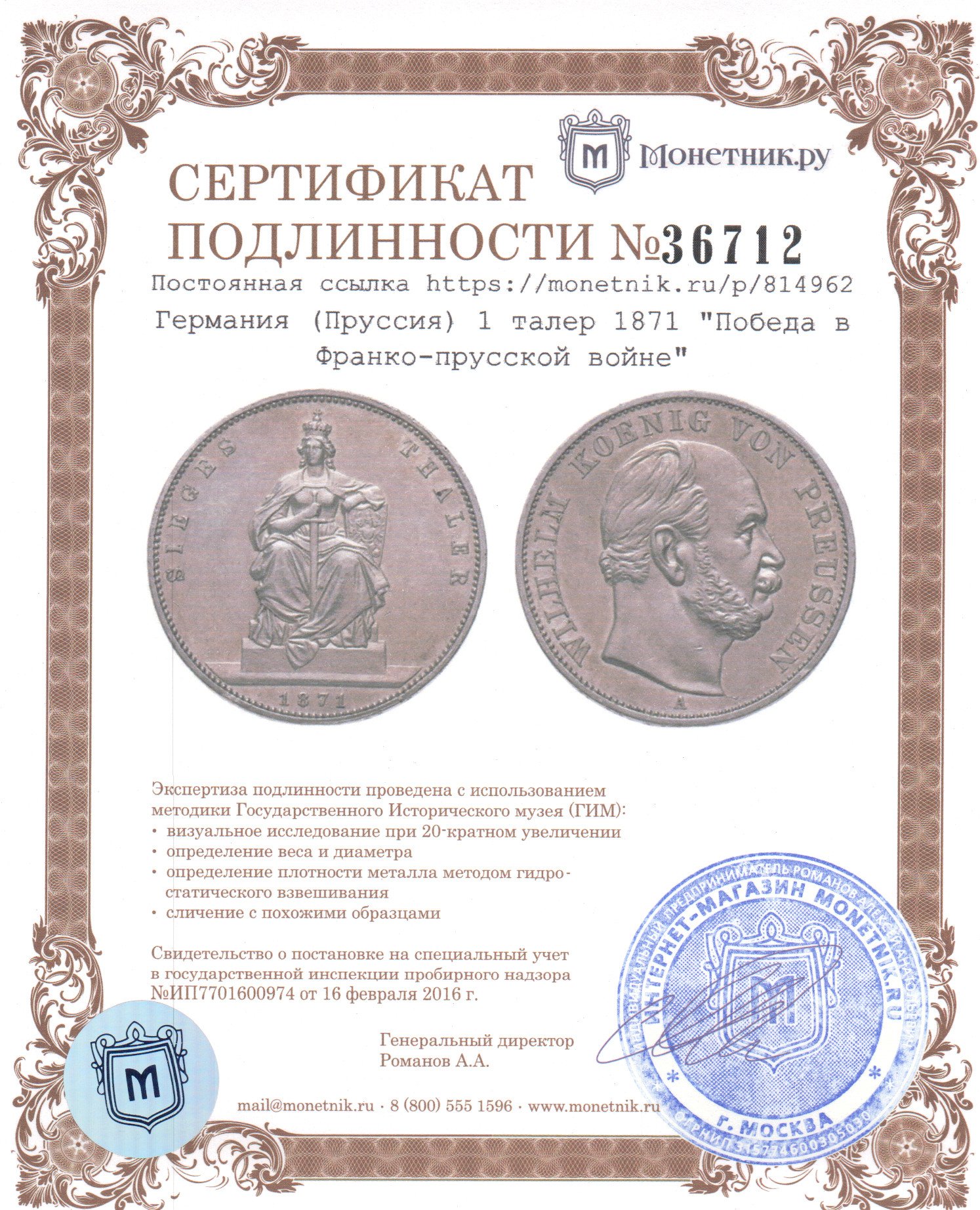 • Сертификат подлинности: № 36712