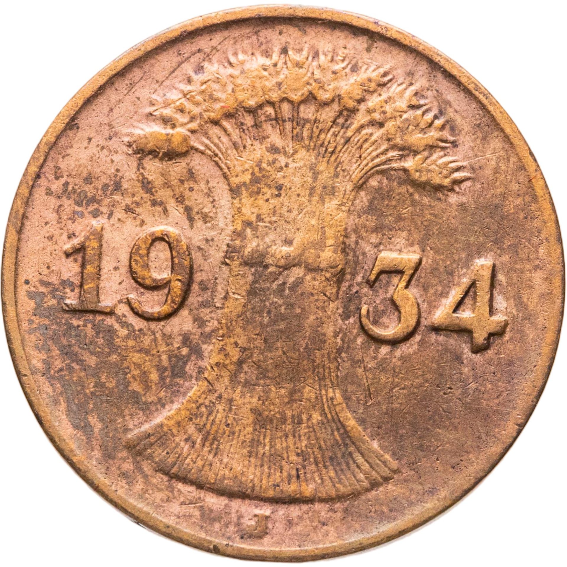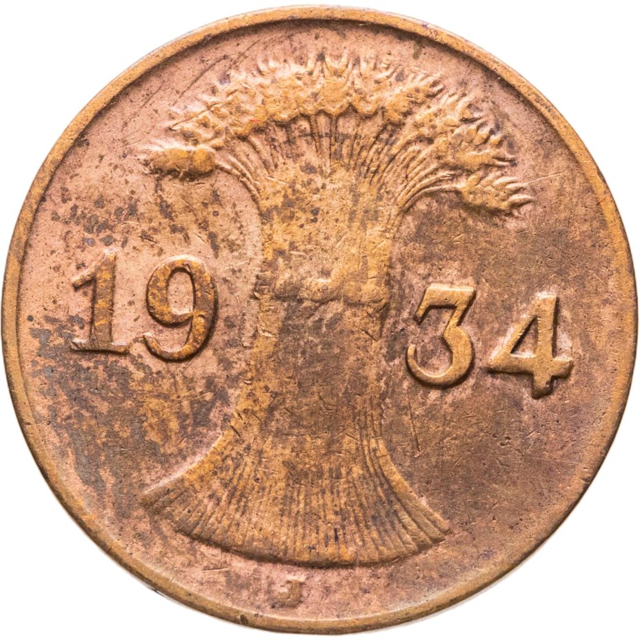 Германия 1 рейхспфенниг (reichspfennig) 1934 J знак монетного двора "J" — Гамбург