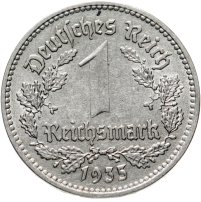 В центре номинал, окружённый венком из дубовых листьев . Надписи: Deutsches Reich / 1 / Reichsmark / 1935.