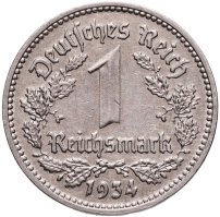 В центре номинал, окружённый венком из дубовых листьев . Надписи: Deutsches Reich / 1 / Reichsmark / 1934.