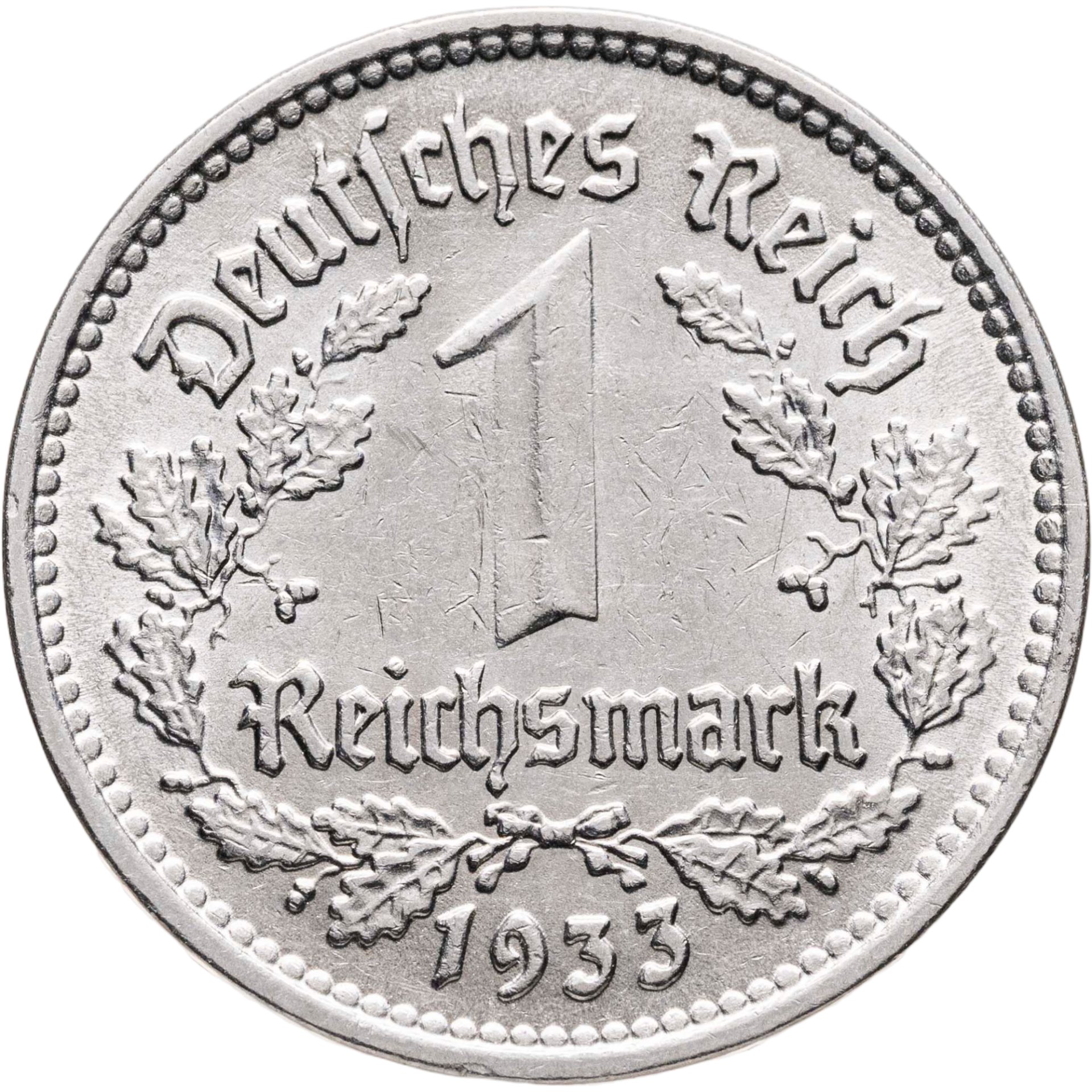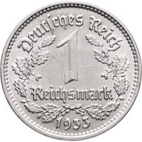 В центре номинал, окружённый венком из дубовых листьев . Надписи: Deutsches Reich / 1 / Reichsmark / 1933.