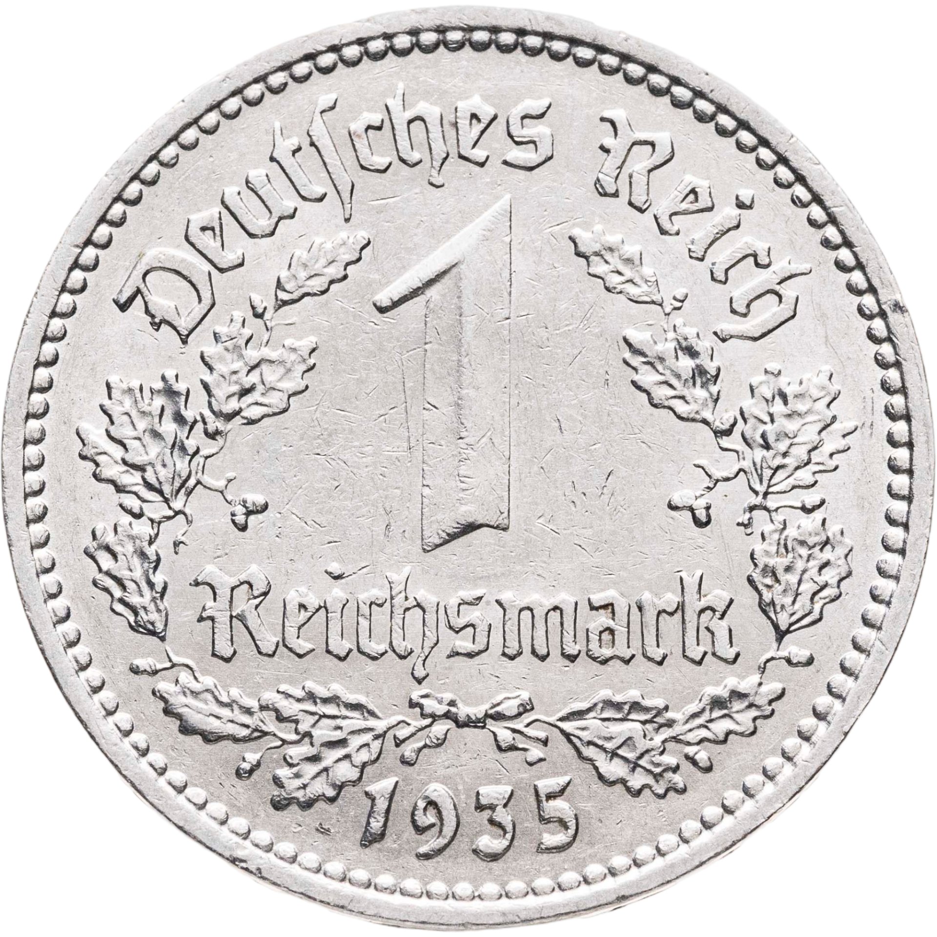 В центре номинал, окружённый венком из дубовых листьев . Надписи: Deutsches Reich / 1 / Reichsmark / 1935.