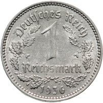 В центре номинал, окружённый венком из дубовых листьев . Надписи: Deutsches Reich / 1 / Reichsmark / 1936.