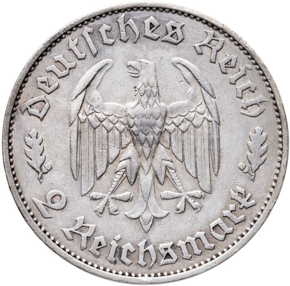 Особо следует отметить памятные монеты Третьего Рейха. Они выпускались из серебра и были двух номиналов: 2 и 5 рейхсмарок. Особенностью их является то, что у обоих номиналов абсолютно одинаковый дизайн и различия только в диаметре и процентным содержанием серебра.