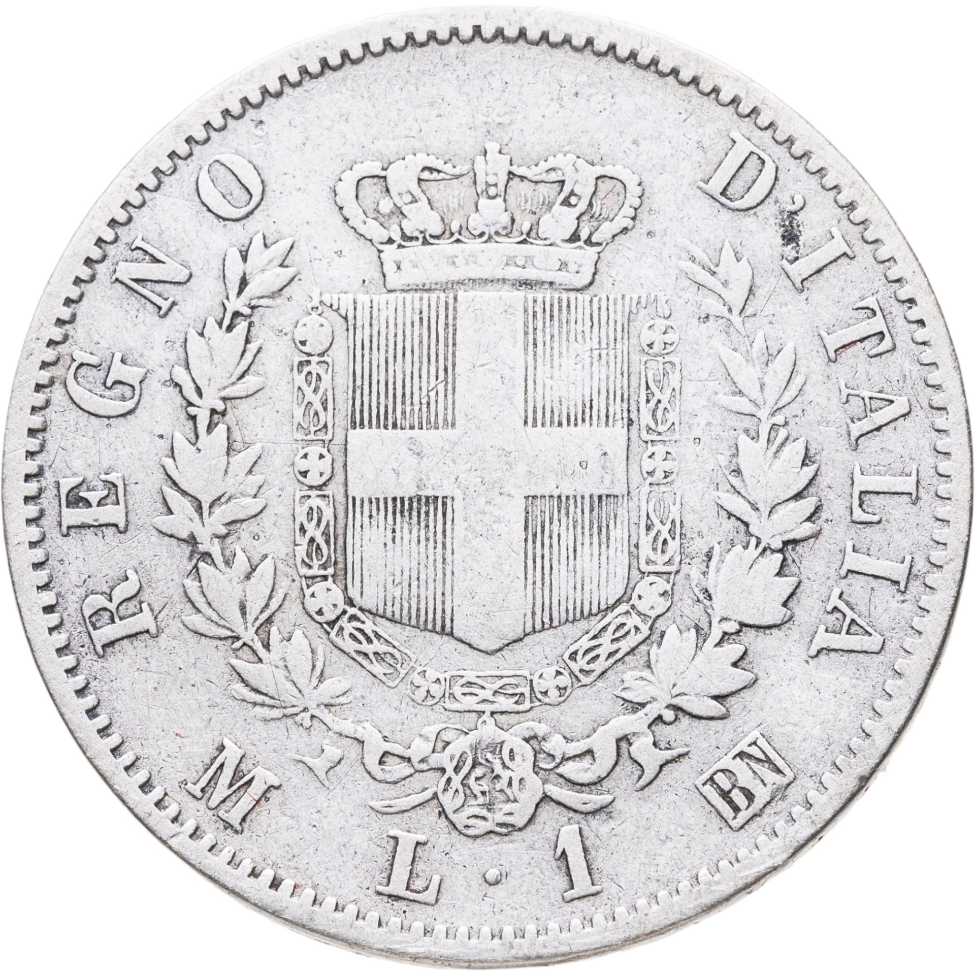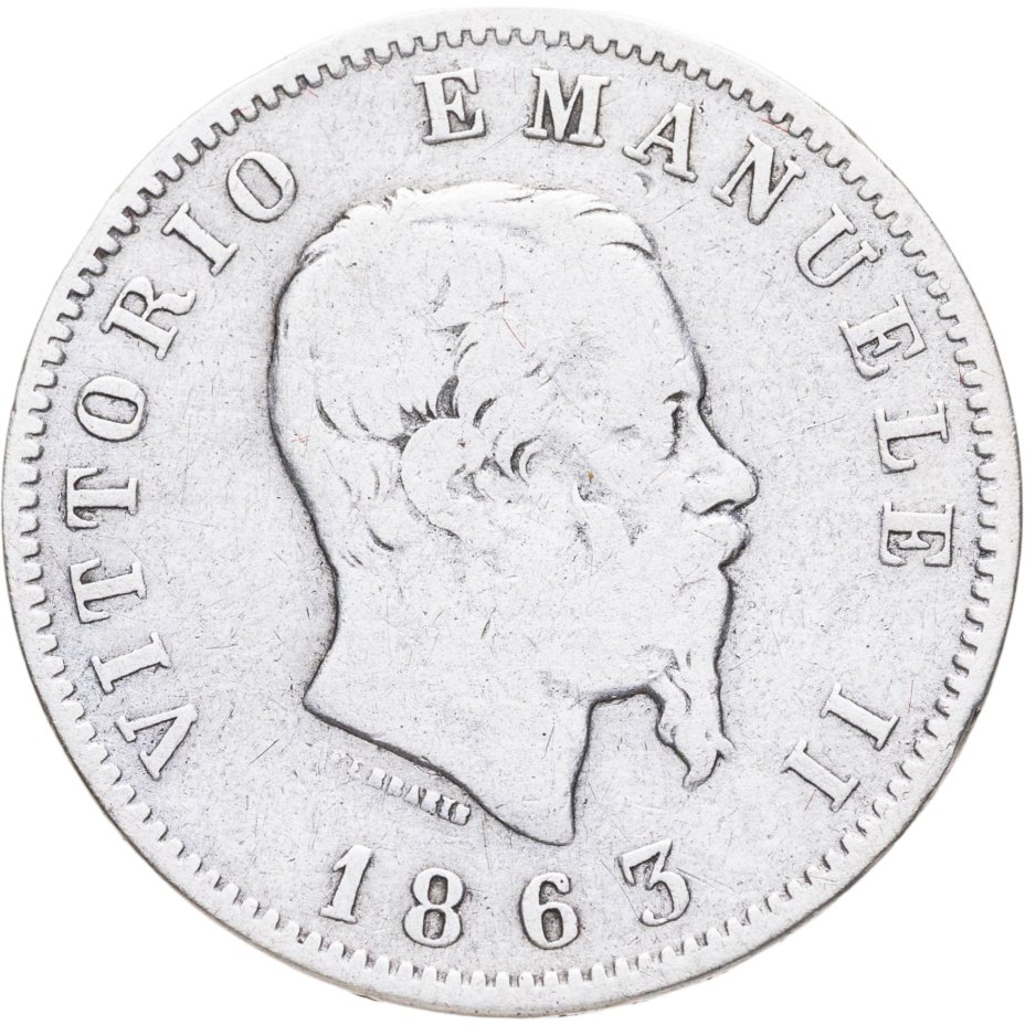 Италия 1 лира (lira) 1863 M Щит на реверсе знак монетного двора: "M" - Милан