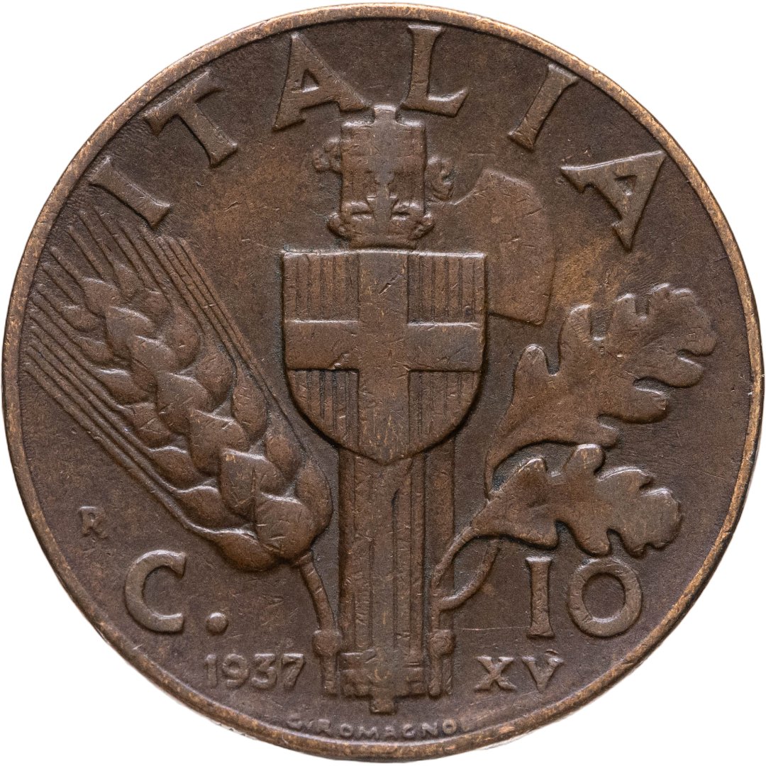 Италия 10 чентезимо (centesimi) 1937 Новый реверс: Герб