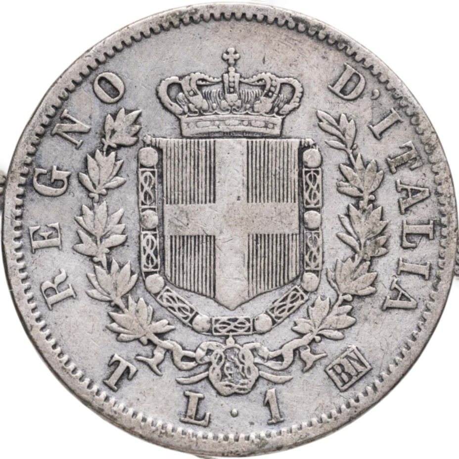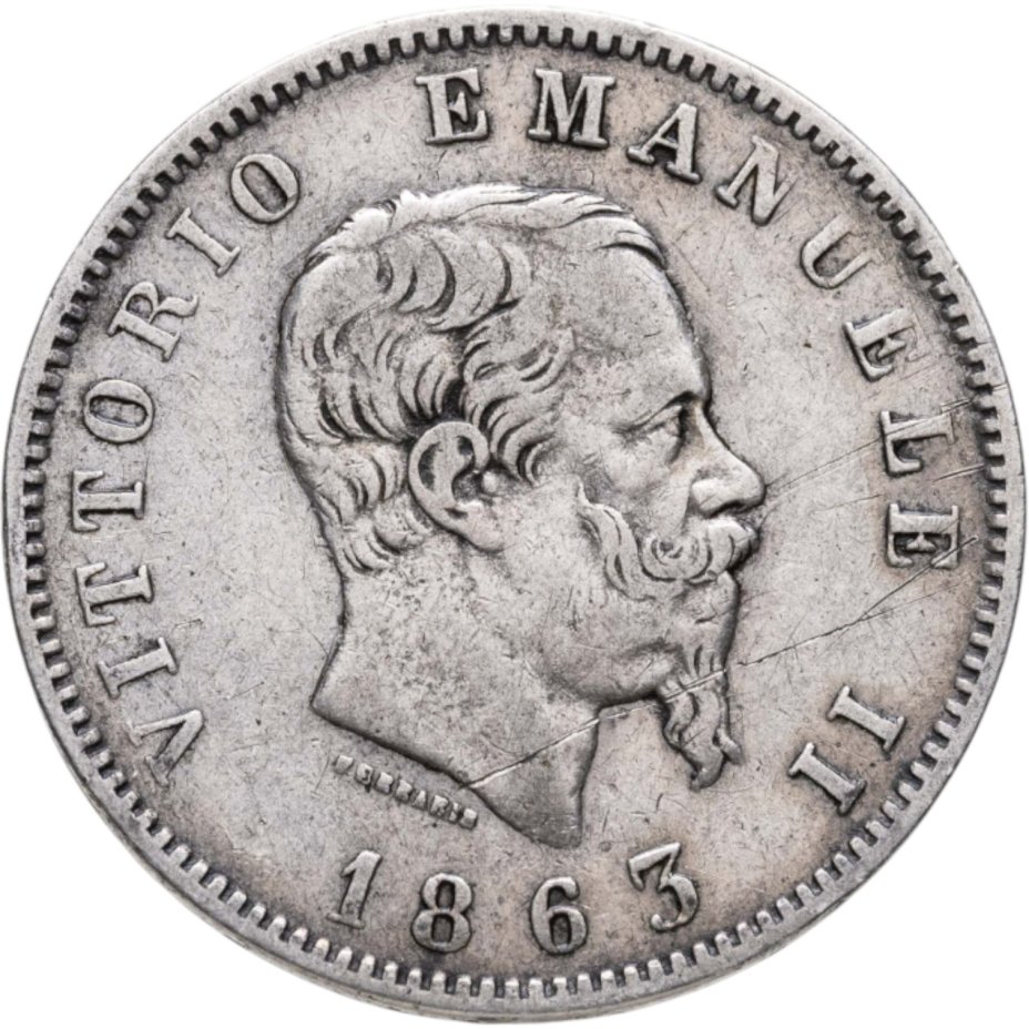 Италия 1 лира (lira) 1863 Щит на реверсе знак монетного двора: "T" - Турин