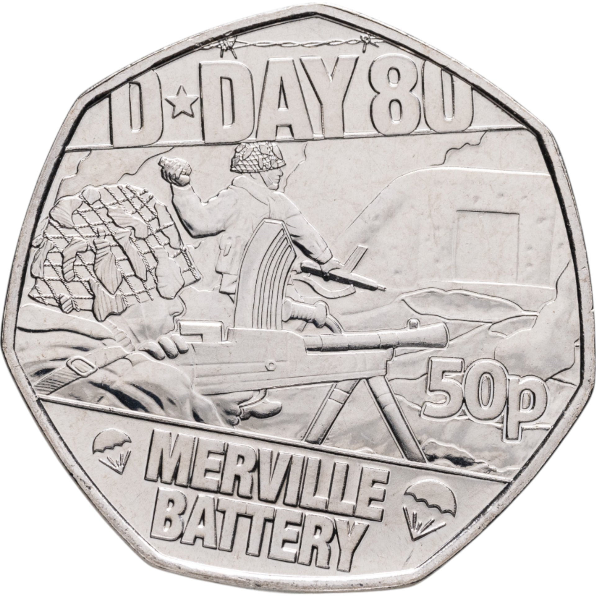 Джерси 50 пенсов 2024 « 80 лет высадке союзников в Нормандии (D-Day). Батарея Мервилла (Merville Battery)»