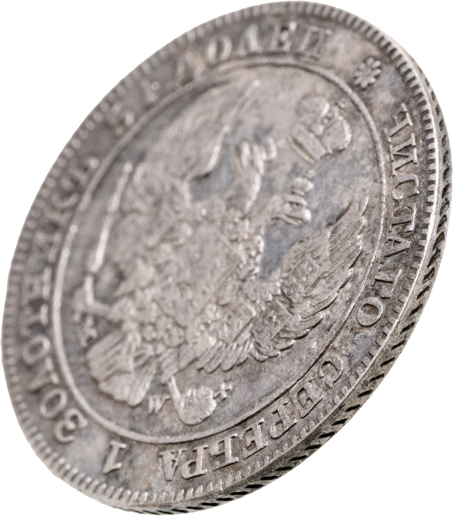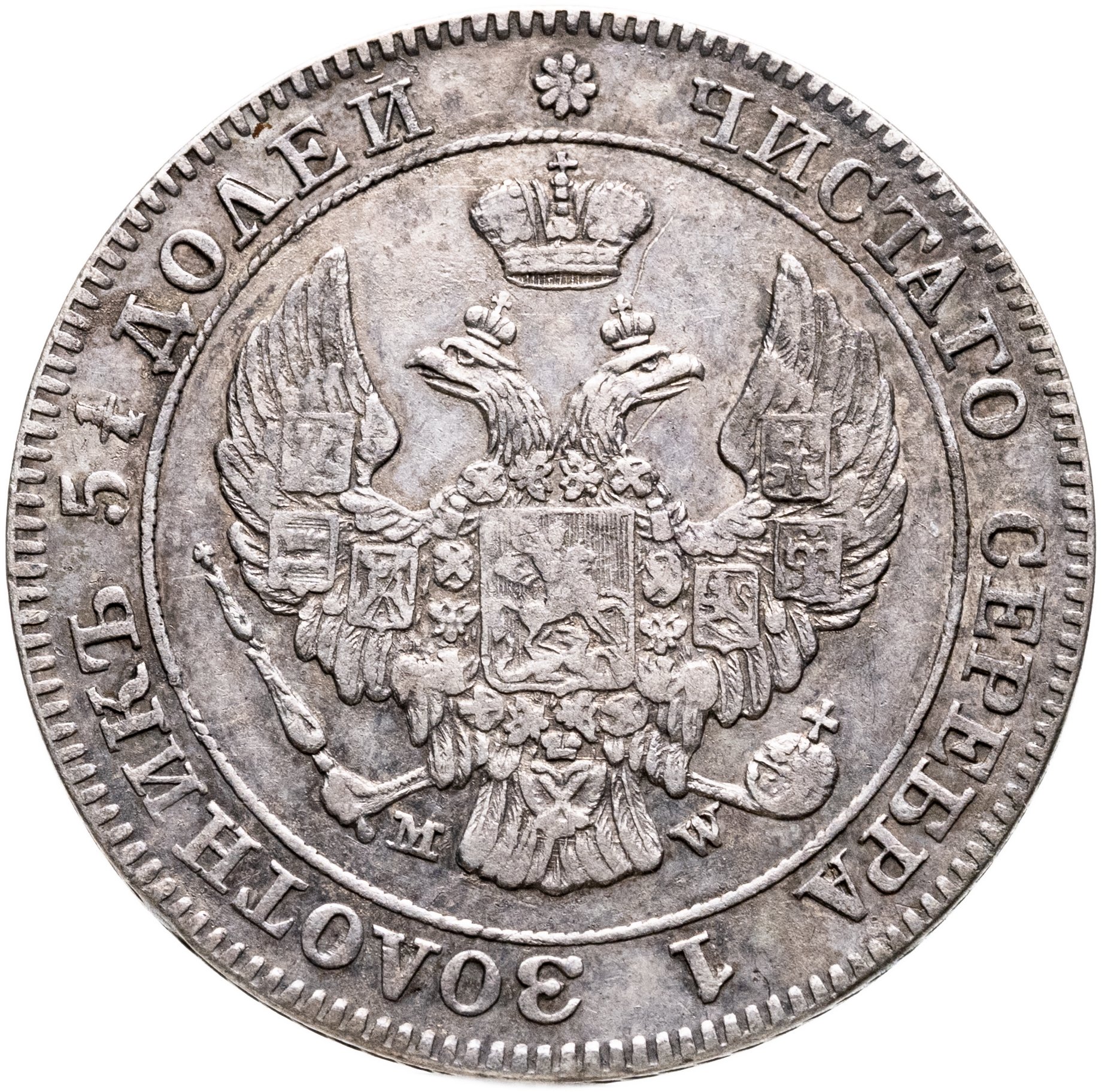 В центре изображен Государственный Герб Российской империи - двуглавый орёл, головы которого увенчаны двумя коронами, третья, большая корона над ними. На груди орла расположен Московский герб - щит с изображением Георгия Победоносца, поражающего копьем дракона. Вокруг щита орденская цепь с орденом Св. Апостола Андрея Первозванного. На крыльях изображены титульные гербы: на правом — Казанский, Астраханский и Сибирский, на левом — Польский, Таврический и Финляндский. В правой лапе орла – скипетр, в левой – держава. Под правой лапой – буква «M», под левой – буква «W». Обозначение Варшавского монетного двора. Центральная часть отделена от остального изображения витой окружностью. За окружностью круговая надпись: «ЧИСТАГО СЕРЕБРА 1 ЗОЛОТНИКЪ 5 1/4 ДОЛЕЙ», разделенная сверху цветочной розеткой. По окружности канта имеются рельефные элементы, выполненные в виде зубцов.