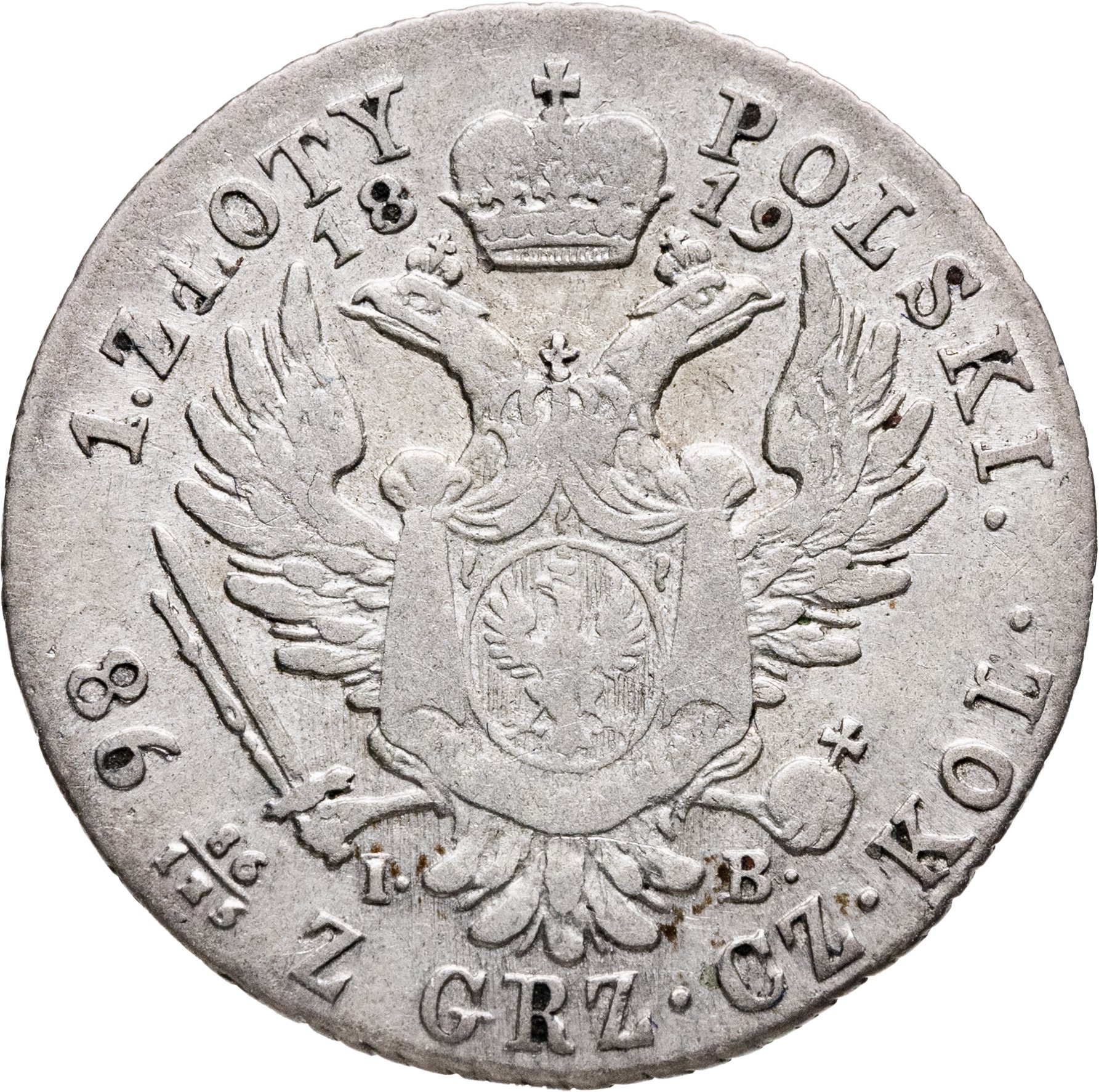 В центре двуглавый орёл, головы которого увенчаны двумя коронами, третья, большая корона над ними. На груди орла герб Польского королевства под королевской короной и пологом. В правой лапе орла – скипетр и меч, в левой – держава. Под правой лапой – литера «I•», под левой – литера «B•». Инициалы минцмейстера Jacub Benik (Яков Беник). Над головами орла – дата выпуска «1819», разделённая большой короной. Вокруг орла круговая надпись: «1. ZŁOTY POLSKI. 86 86/125 Z GRZ• CZ• KOL•».