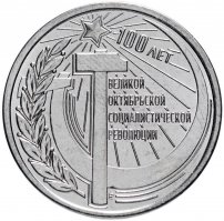Центральный банк Приднестровской Молдавской Республики посвятил этому примечательному событию монету достоинством 1 приднестровский рубль, отчеканенную монетным двором Тирасполя тиражом 50 000 (до момента основания собственного производства в 2005 году – государственного учреждения «ГОСЗНАК» – монеты Приднестровья изготавливались в Польше). Юбилейный рубль был введен в обращение 25 октября 2017 года. Монета выполнена из недрагоценного сплава – никелированной стали. Диаметр составляет 22 мм, толщина – 1,9 мм, масса – 4,65 гр. Гурт гладкий. Выпуск произведён вне серии. Однако заметим, что ПМР также отчеканила к столетию Октября и монеты номиналом в 3 приднестровских рубля и, выпущенные тиражом 250 штук, серебряные 10 рублей.