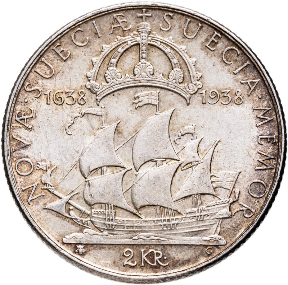 Купить Швеция 2 кроны 1938 "300 лет поселению Делавэр"