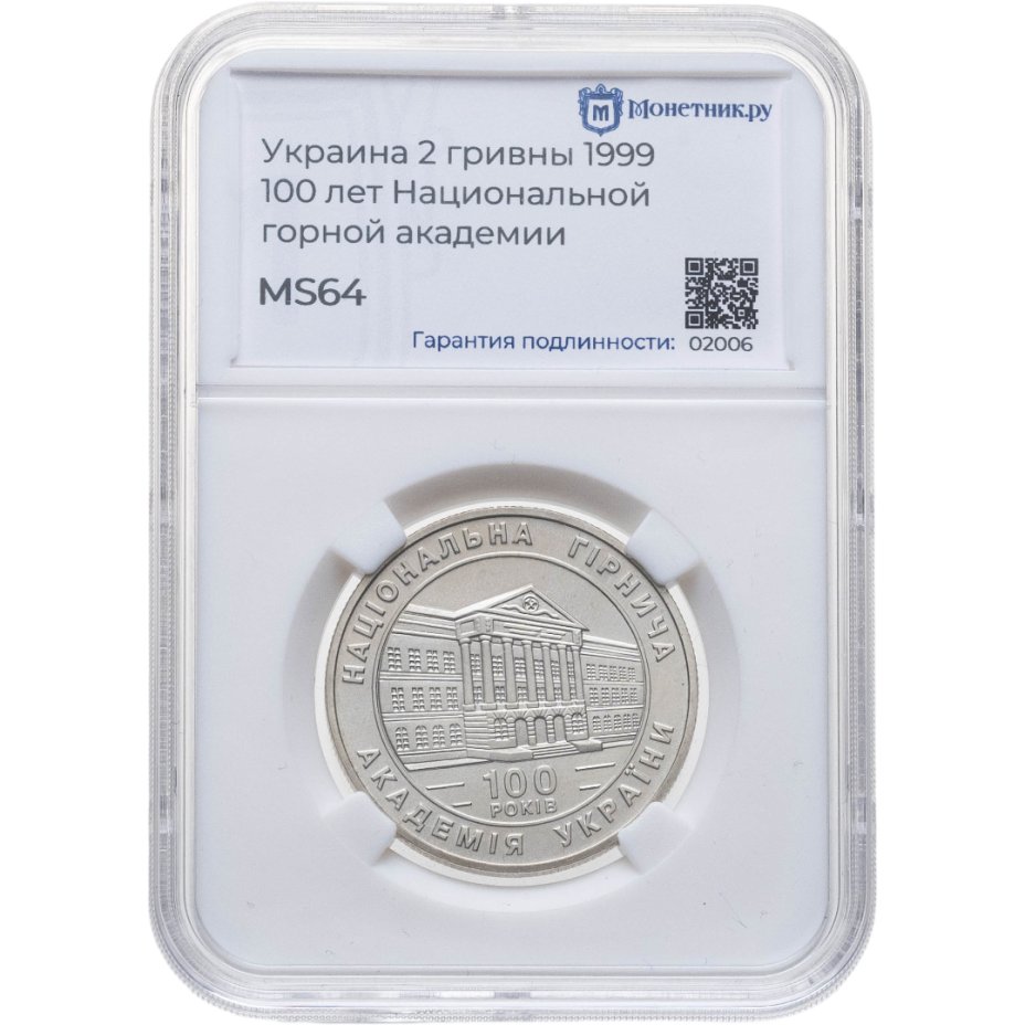 Купить Украина 2 гривны 1999 "100 лет Национальной горной академии Украины" в слабе Монетник.ру MS64